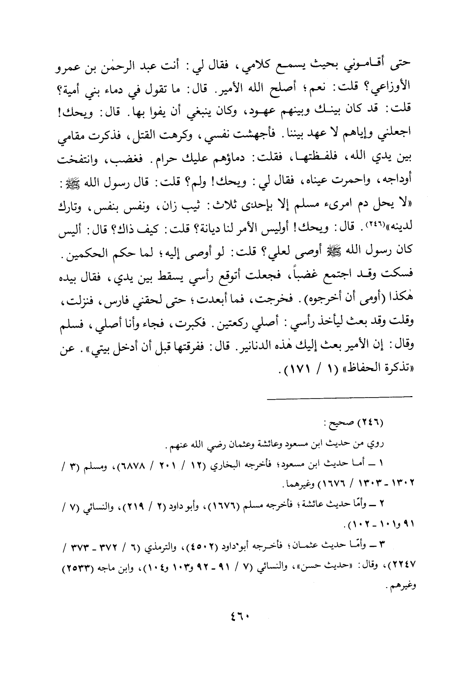 حتى أقاموني بحيث يسمع كلامي، فقال لي: أنت عبد الرحمن بن عمرو الأوزاعي؛ قلت: نعم؛ أصلح الله الأمير. قال: ما تقول في دماء بني أمية؛ قلت: قد كان بينك وبينهم عهود، وكان ينبغي أن يفوا بها. قال: ويحك! اجعلني وإياهم لا عهد بيننا. فأجهشت نفسي، وكرهت القتل، فذكرت مقامي بين يدي الله، فلفظتها، فقلت: دماؤهم عليك حرام. فغضب، وانتفخت أوداجه، واحمرت عيناه، فقال لي: ويحك! ولم؟ قلت: قال رسول الله - صلى الله عليه وسلم -: «لَا يَحِلُّ دَمُ امْرِئٍ مُسْلِمٍ إِلَّا بِإِحْدَى ثَلَاثٍ: ثَيِّبٌ زَانٍ، وَنَفْسٌ بِنَفْسٍ، وَتَارِكٌ لِدِينِهِ» (246). قال: ويحك! أوليس الأمر لنا ديانة؟ قلت: كيف ذاك؟ قال: أليس كان رسول الله - صَلَّى اللهُ عَلَيْهِ وَسَلَّمَ - أوصى لعلي؟ قلت: لو أوصى إليه، لما حكم الحكمين. فسكت وقد اجتمع غضباً، فجعلت أتوقع رأسي يسقط بين يدي، فقال بيده هكذا (أومى أن أخرجوه). فخرجت، فما أبعدت؛ حتى لحقني فارس، فنزلت، وقلت وقد بعث ليأخذ رأسي: أصلي ركعتين. فكبرت، فجاء وأنا أصلي، فسلم وقال: إن الأمير بعث إليك هذه الدنانير. قال: ففرقتها قبل أن أدخل بيتي ". عن " تذكرة الحفاظ " (1/ 171).