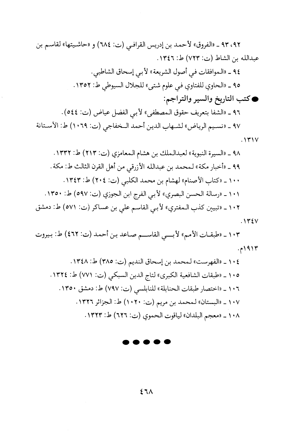 92، 93 - "الفروق" لأحمد بن إدريس القرافي (ت: 684) و "حاشيتها" لقاسم بن عبد الله بن الشاط (ت: 723) ط: 1346.