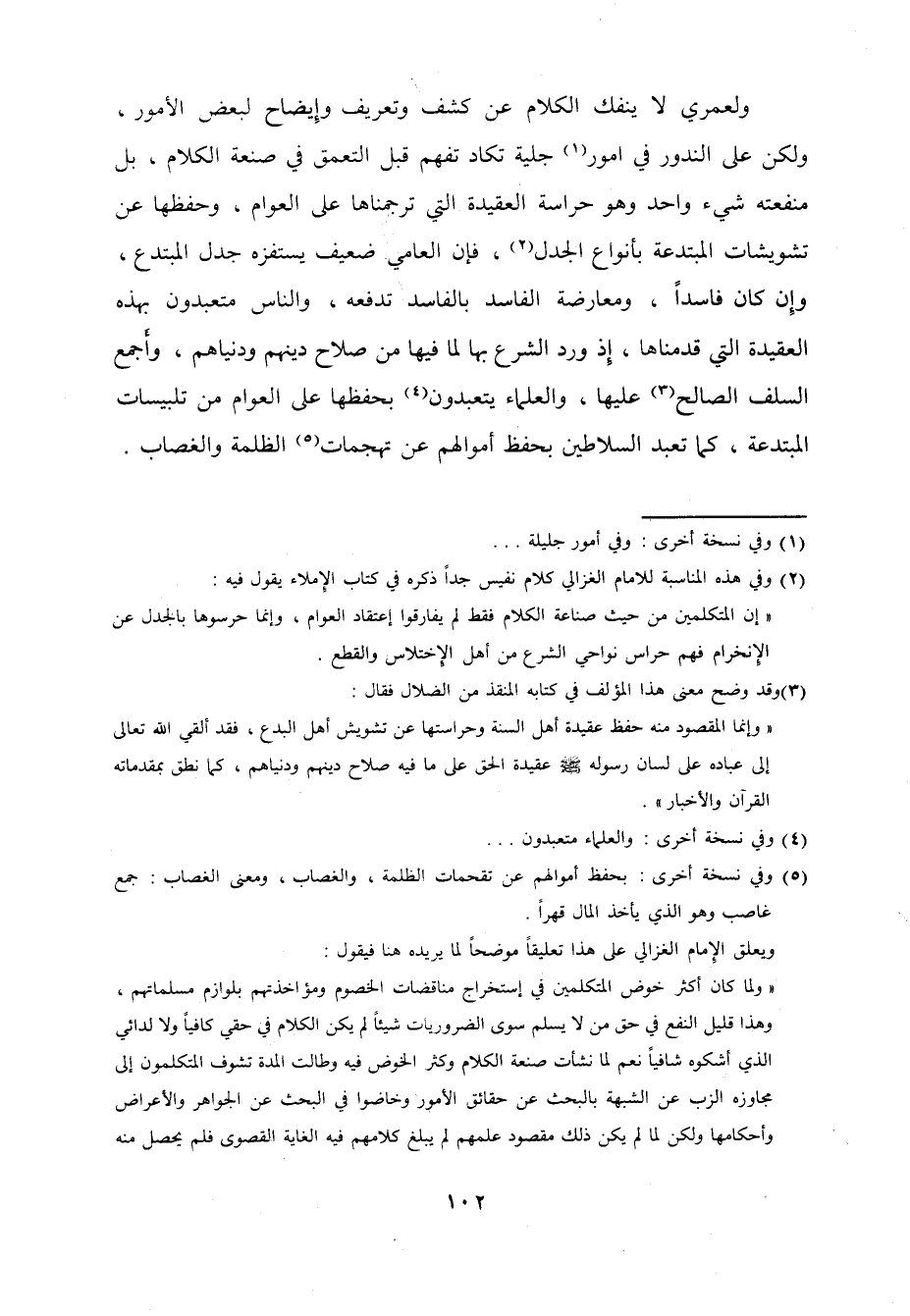 ولعمري لَا يَنْفَكّ الْكَلَام عَن كشف وتعريف وإيضاح لبَعض الْأُمُور وَلَكِن على الندور فِي أُمُور جلية تكَاد تفهم قبل التعمق فِي صَنْعَة الْكَلَام بل منفعَته شَيْء وَاحِد وَهُوَ حراسة العقيدة الَّتِي ترجمناها على الْعَوام وحفظها عَن تشويشات المبتدعة بأنواع الجدل فَإِن الْعَاميّ ضَعِيف يستفزه جدل المبتدع وَإِن كَانَ فَاسِدا ومعارضة الْفَاسِد بالفاسد تَدْفَعهُ وَالنَّاس متعبدون بِهَذِهِ العقيدة الَّتِي قدمناها إِذْ ورد الشَّرْع بهَا لما فِيهَا من صَلَاح دينهم ودنياهم وَأجْمع السّلف الصَّالح عَلَيْهَا وَالْعُلَمَاء يتعبدون بحفظها على الْعَوام من تلبيسات المبتدعة كَمَا تعبد السلاطين بِحِفْظ أَمْوَالهم عَن تهجمات الظلمَة والغصاب