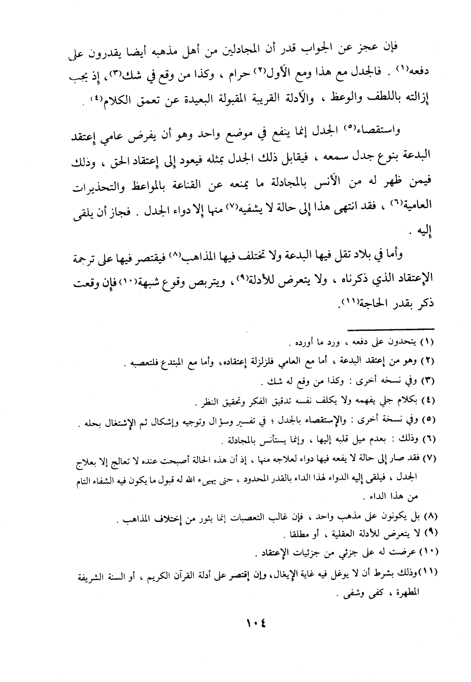 وإستقصاء الجدل إِنَّمَا ينفع فِي مَوضِع وَاحِد وَهُوَ أَن يفْرض عَامي إعتقد الْبِدْعَة بِنَوْع جدل سَمعه فيقابل ذَلِك الجدل بِمثلِهِ فَيَعُود إِلَى إعتقاد الْحق وَذَلِكَ فِيمَن ظهر لَهُ من الْأنس بالمجادلة مَا يمنعهُ عَن القناعة بالمواعظ والتحذيرات العامية فقد انْتهى هَذَا إِلَى حَالَة لَا يشفيه مِنْهَا إِلَّا دَوَاء الجدل