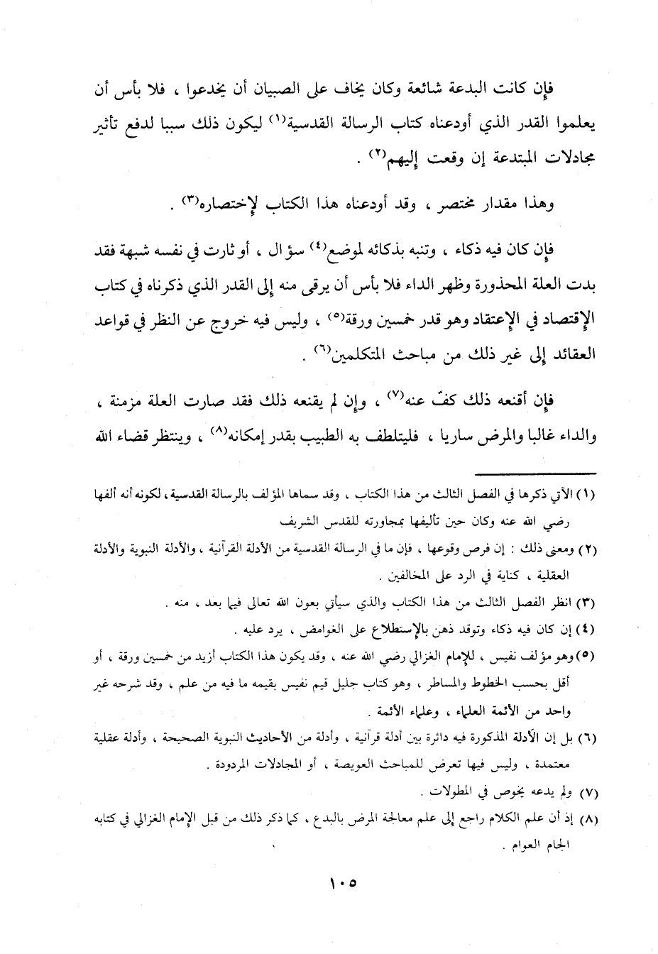 فَإِن كَانَت الْبِدْعَة شائعة وَكَانَ يخَاف على الصّبيان أَن يخدعوا فَلَا بَأْس أَن يعلمُوا الْقدر الَّذِي أودعناه كتاب الرسَالَة القدسية ليَكُون ذَلِك سَببا لدفع تَأْثِير مجادلات المبتدعة إِن وَقعت إِلَيْهِم