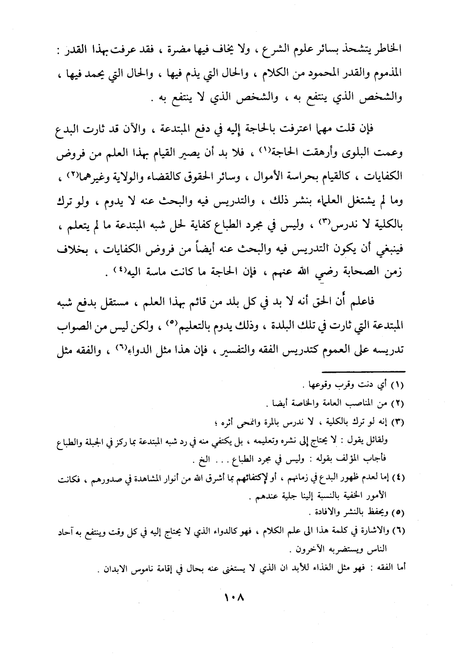 فَاعْلَم أَن الْحق أَنه لَا بُد فِي كل بلد من قَائِم بِهَذَا الْعلم مُسْتَقل بِدفع شبه المبتدعة الَّتِي ثارت فِي تِلْكَ الْبَلدة وَذَلِكَ يَدُوم بالتعليم وَلَكِن لَيْسَ من الصَّوَاب تدريسه على الْعُمُوم كتدريس الْفِقْه وَالتَّفْسِير فَإِن هَذَا مثل الدَّوَاء وَالْفِقْه مثل