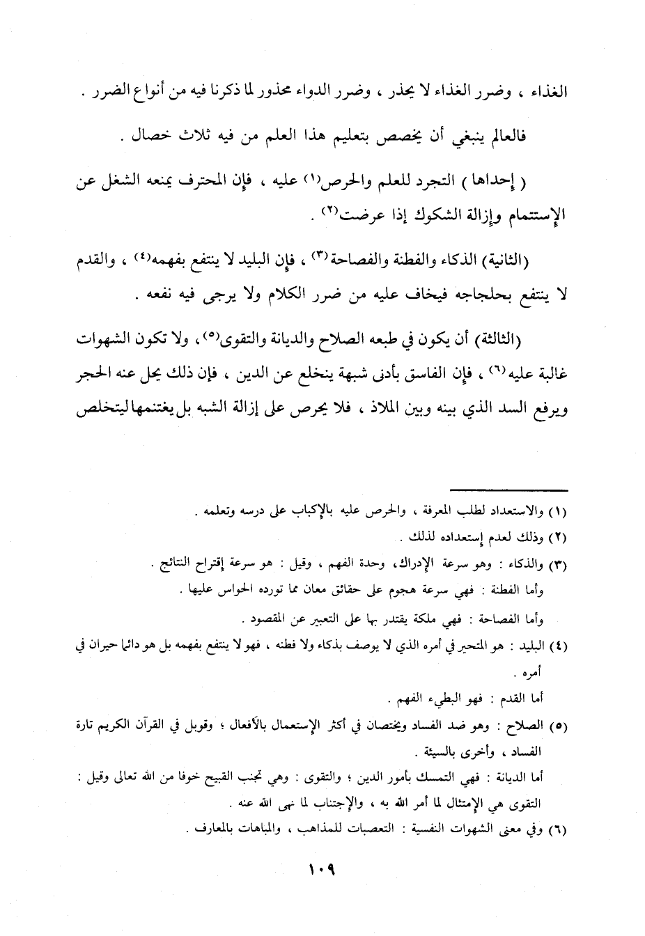 الثَّانِيَة الذكاء والفطنة والفصاحة فَإِن البليد لَا ينْتَفع بفهمه والقدم لَا ينْتَفع بحلجاجه فيخاف عَلَيْهِ من ضَرَر الْكَلَام وَلَا يُرْجَى فِيهِ نَفعه