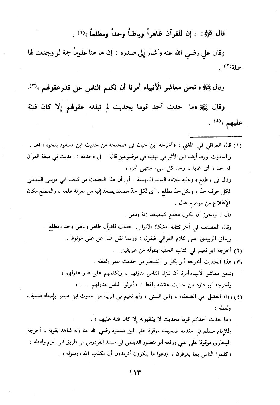 قَالَ صلى الله عَلَيْهِ وَسلم إِن لِلْقُرْآنِ ظَاهرا وَبَاطنا وحدا ومطلعا