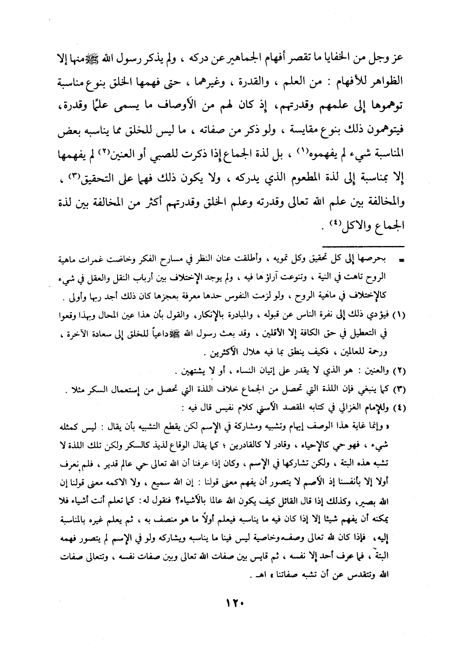 عز وَجل من الخفايا مَا تقصر أفهام الجماهير عَن دركه وَلم يذكر رَسُول الله صلى الله عَلَيْهِ وَسلم مِنْهَا إِلَّا الظَّوَاهِر للأفهام من الْعلم وَالْقُدْرَة وَغَيرهمَا حَتَّى فهمها الْخلق بِنَوْع مُنَاسبَة توهموها إِلَى علمهمْ وقدرتهم إِذْ كَانَ لَهُم من الْأَوْصَاف مَا يُسمى علما وقدرة فيتوهمون ذَلِك بِنَوْع مقايسة وَلَو ذكر من صِفَاته مَا لَيْسَ لِلْخلقِ مِمَّا يُنَاسِبه بعض الْمُنَاسبَة شَيْء لم يفهموه بل لَذَّة الْجِمَاع إِذا ذكرت للصَّبِيّ أَو الْعنين لم يفهمها إِلَّا بمناسبة إِلَى لَذَّة المطعوم الَّذِي يُدْرِكهُ وَلَا يكون ذَلِك فهما على التَّحْقِيق والمخالفة بَين علم الله تَعَالَى وَقدرته وَعلم الْخلق وقدرتهم أَكثر من الْمُخَالفَة بَين لَذَّة الْجِمَاع وَالْأكل
