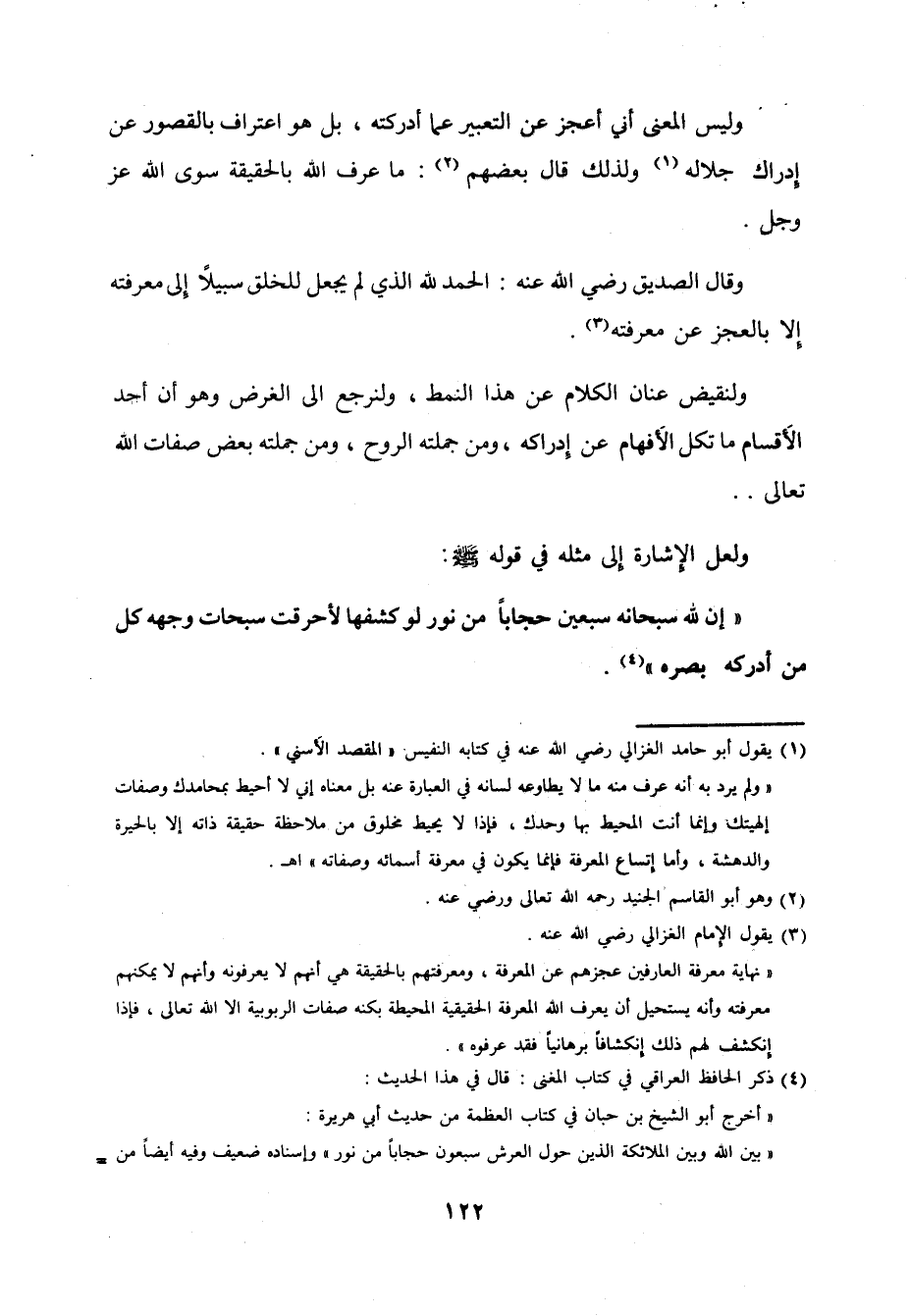 ولنقيض عنان الْكَلَام عَن هَذَا النمط ولنرجع إِلَى الْغَرَض وَهُوَ أَن أحد الْأَقْسَام مَا تكل الأفهام عَن إِدْرَاكه وَمن جملَته الرّوح وَمن جملَته بعض صِفَات الله تَعَالَى