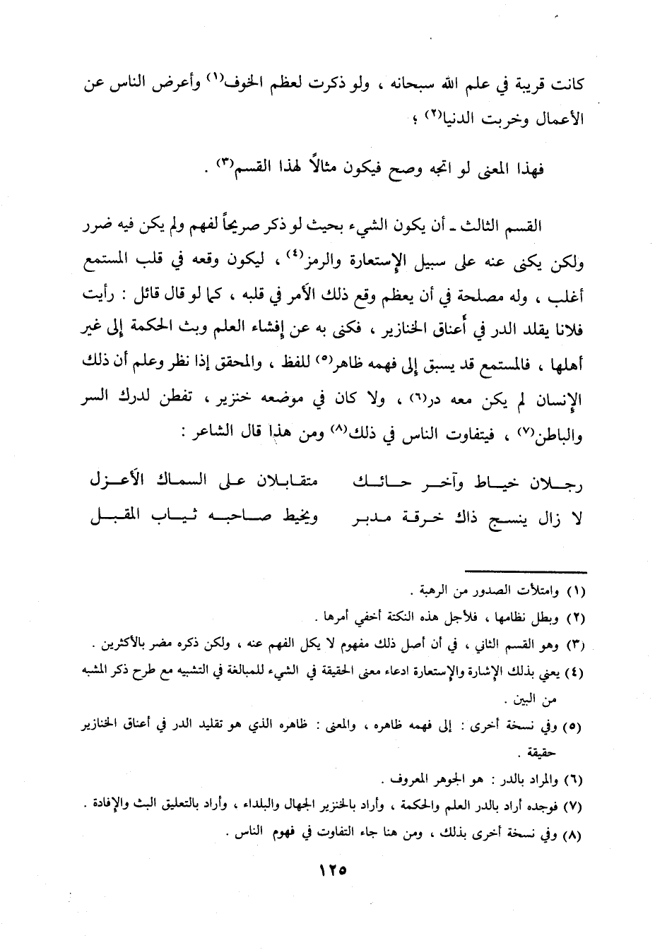 الْقسم الثَّالِث أَن يكون الشَّيْء بِحَيْثُ لَو ذكر صَرِيحًا لفهم وَلم يكن فِيهِ ضَرَر وَلَكِن يكنى عَنهُ على سَبِيل الإستعارة وَالرَّمْز ليَكُون وقعه فِي قلب المستمع أغلب وَله مصلحَة فِي أَن يعظم وَقع ذَلِك الْأَمر فِي قلبه كَمَا لَو قَالَ قَائِل رَأَيْت فلَانا يُقَلّد الدّرّ فِي أَعْنَاق الْخَنَازِير فكنى بِهِ عَن إفشاء الْعلم وَبث الْحِكْمَة إِلَى غير أَهلهَا فالمستمع قد يسْبق إِلَى فهمه ظَاهر للفظ والمحقق إِذا نظر وَعلم أَن ذَلِك الْإِنْسَان لم يكن مَعَه در وَلَا كَانَ فِي مَوْضِعه خِنْزِير تفطن لدرك السِّرّ وَالْبَاطِن فيتفاوت النَّاس فِي ذَلِك وَمن هَذَا قَالَ الشَّاعِر