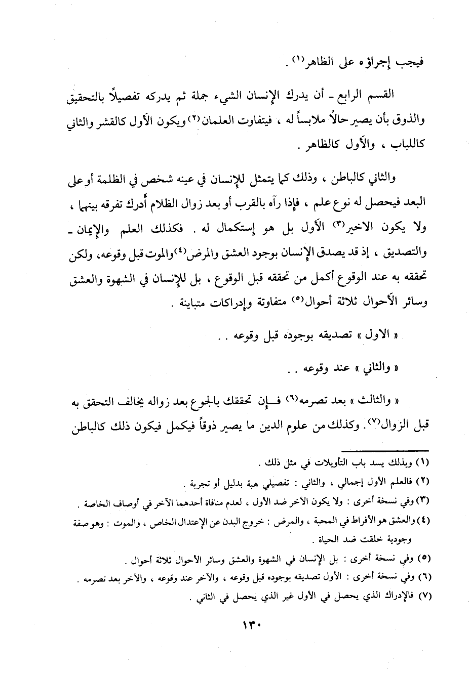 الْقسم الرَّابِع أَن يدْرك الْإِنْسَان الشَّيْء جملَة ثمَّ يُدْرِكهُ تَفْصِيلًا بالتحقيق والذوق بِأَن يصير حَالا ملابسا لَهُ فيتفاوت العلمان وَيكون الأول كالقشر وَالثَّانِي كاللباب وَالْأول كَالظَّاهِرِ