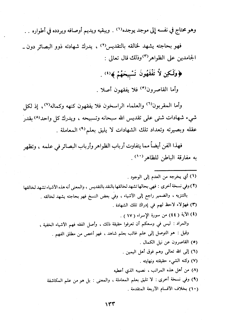 وَأما المقربون وَالْعُلَمَاء الراسخون فَلَا يفقهُونَ كنهه وكماله إِذْ لكل شَيْء شَهَادَات شَتَّى على تقديس الله سُبْحَانَهُ وتسبيحه وَيدْرك كل وَاحِد بِقدر عقله وبصيرته وتعداد تِلْكَ الشَّهَادَات لَا يَلِيق بِعلم الْمُعَامَلَة