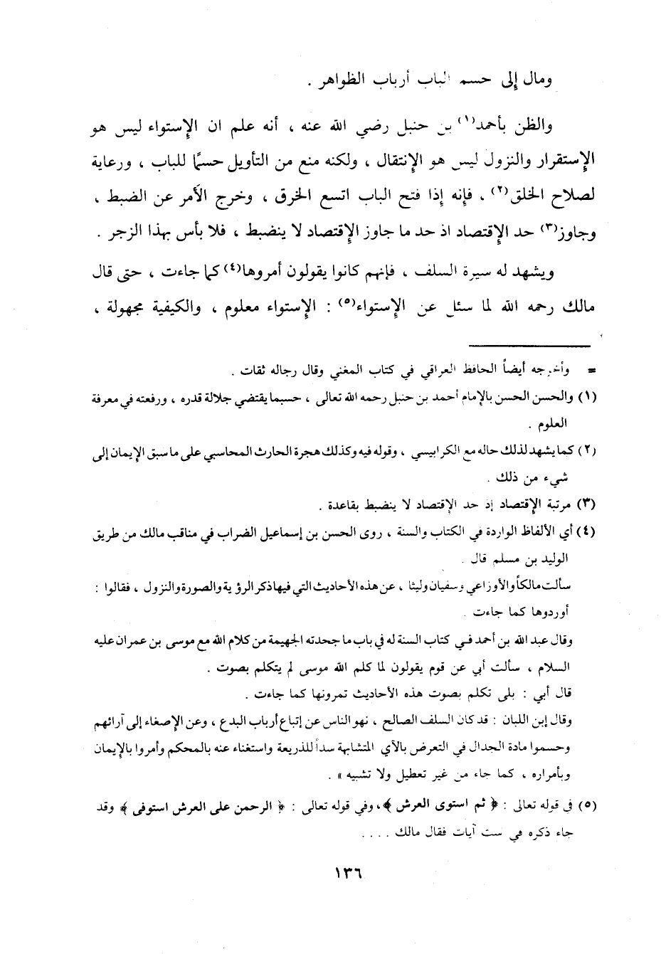 وَالظَّن بِأَحْمَد بن حَنْبَل رَضِي الله عَنهُ أَنه علم أَن الإستواء لَيْسَ هُوَ الإستقرار وَالنُّزُول لَيْسَ هُوَ الإنتقال وَلكنه منع من التَّأْوِيل حسما للباب ورعاية لصلاح الْخلق فَإِنَّهُ إِذا فتح الْبَاب اتَّسع الْخرق وَخرج الْأَمر عَن الضَّبْط وَجَاوَزَ حد الإقتصاد إِذْ حد مَا جَاوز الإقتصاد لَا يَنْضَبِط فَلَا بَأْس بِهَذَا الزّجر