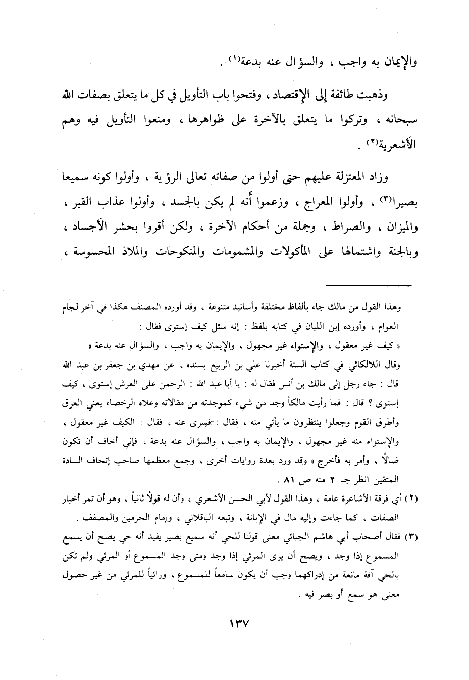 وَزَاد الْمُعْتَزلَة عَلَيْهِم حَتَّى أولُوا من صِفَاته تَعَالَى الرُّؤْيَة وَأولُوا كَونه سميعا بَصيرًا وَأولُوا الْمِعْرَاج وَزَعَمُوا أَنه لم يكن بالجسد وَأولُوا عَذَاب الْقَبْر وَالْمِيزَان والصراط وَجُمْلَة من أَحْكَام الْآخِرَة وَلَكِن أقرُّوا بحشر الأجساد وبالجنة واشتمالها على المأكولات والمشمومات والمنكوحات والملاذ المحسوسة