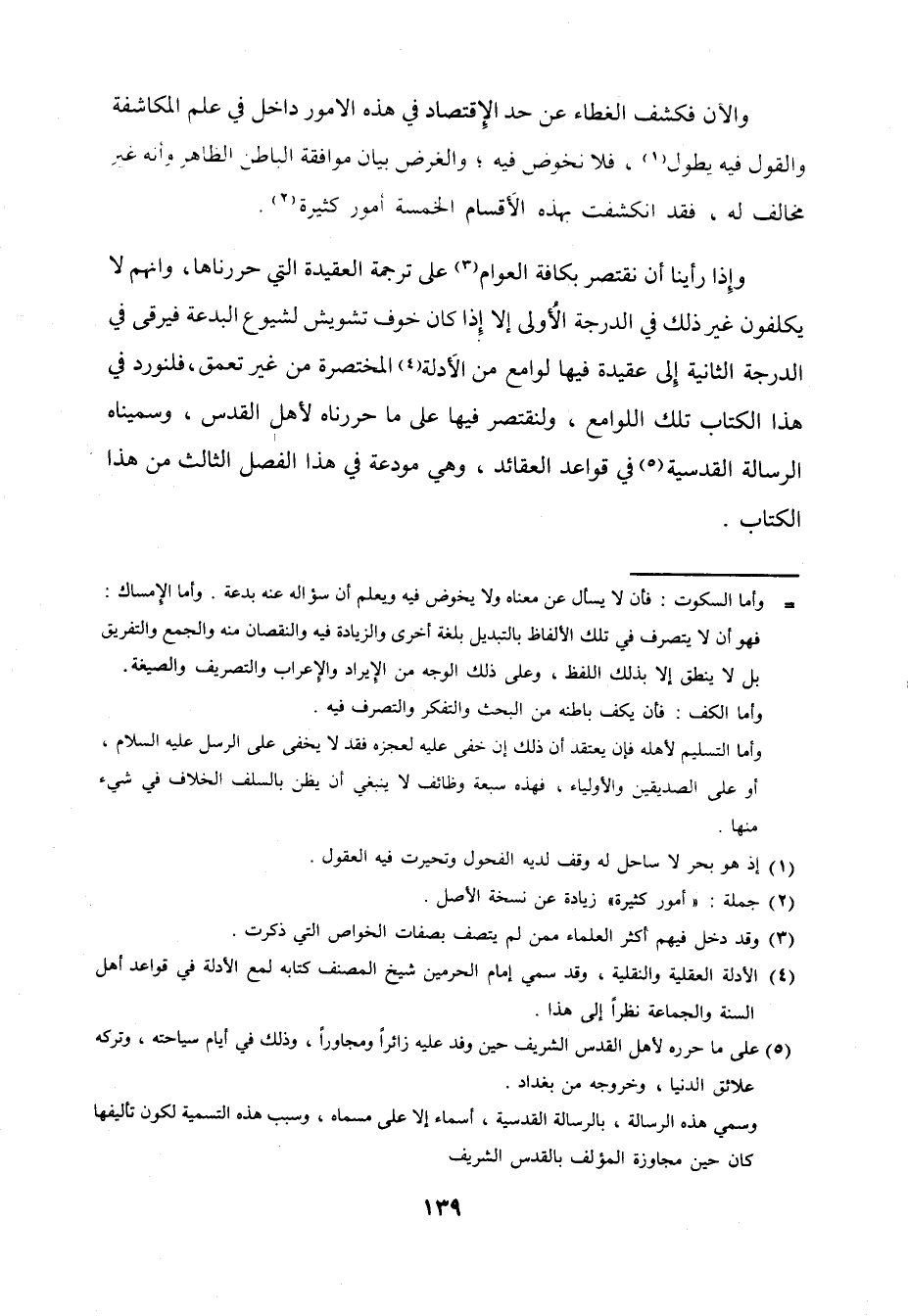 وَإِذا رَأينَا أَن نقتصر بكافة الْعَوام على تَرْجَمَة العقيدة الَّتِي حررناها وَأَنَّهُمْ لَا يكلفون غير ذَلِك فِي الدرجَة الأولى إِلَّا إِذا كَانَ خوف تشويش لشيوع الْبِدْعَة فيرقى فِي الدرجَة الثَّانِيَة إِلَى عقيدة فِيهَا لوامع من الْأَدِلَّة المختصرة من غير تعمق فلنورد فِي هَذَا الْكتاب تِلْكَ اللوامع ولنقتصر فِيهَا على مَا حررناه لأهل الْقُدس وسميناه الرسَالَة القدسية فِي قَوَاعِد العقائد وَهِي مودعة فِي هَذَا الْفَصْل الثَّالِث من هَذَا الْكتاب