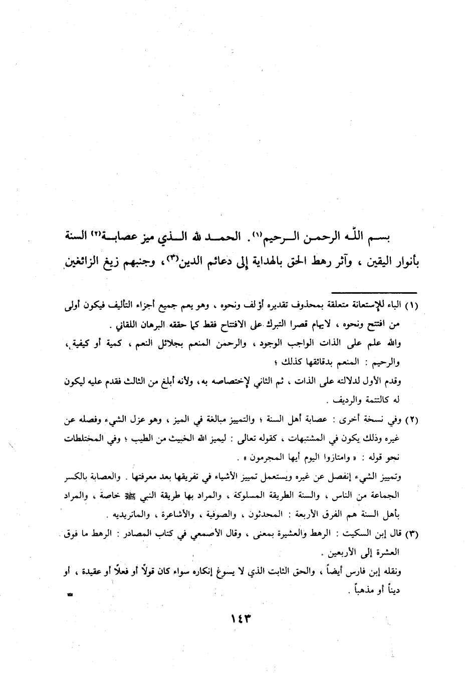 الْحَمد لله الَّذِي ميز عِصَابَة السّنة بأنوار الْيَقِين وآثر رَهْط الْحق بالهداية إِلَى دعائم الدّين وجنبهم زيغ الزائغين
