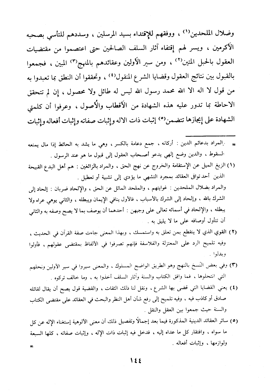 وضلال الْمُلْحِدِينَ ووفقهم للاقتداء بِسَيِّد الْمُرْسلين وسددهم للتأسي بصحبه الأكرمين وَيسر لَهُم اقتفاء آثَار السّلف الصَّالِحين حَتَّى اعتصموا من مقتضيات الْعُقُول بالحبل المتين وَمن سير الْأَوَّلين وعقائدهم بالمنهج الْمُبين فَجمعُوا بِالْقبُولِ بَين نتائج الْعُقُول وقضايا الشَّرْع الْمَنْقُول وتحققوا أنّ النُّطْق بِمَا تعبدوا بِهِ من قَول لَا إِلَه إِلَّا الله مُحَمَّد رَسُول الله لَيْسَ لَهُ طائل وَلَا محصول إِن لم تتَحَقَّق الْإِحَاطَة بِمَا تَدور عَلَيْهِ هَذِه الشَّهَادَة من الأقطاب وَالْأُصُول وَعرفُوا أَن كلمتي الشَّهَادَة على إيجازها تَتَضَمَّن إِثْبَات ذَات الْإِلَه وَإِثْبَات صِفَاته وَإِثْبَات أَفعاله وَإِثْبَات
