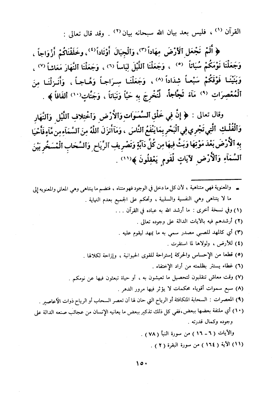 الْقُرْآن فَلَيْسَ بعد بَيَان الله سُبْحَانَهُ بَيَان وَقد قَالَ تَعَالَى {ألم نجْعَل الأَرْض مهادا وَالْجِبَال أوتادا وخلقناكم أَزْوَاجًا وَجَعَلنَا نومكم سباتا وَجَعَلنَا اللَّيْل لباساً وَجَعَلنَا النَّهَار معاشا وبنينا فَوْقكُم سبعا شداداً وَجَعَلنَا سِرَاجًا وهاجا وأنزلنا من المعصرات مَاء ثجاجا لنخرج بِهِ حبا ونباتا وجنات ألفافا}