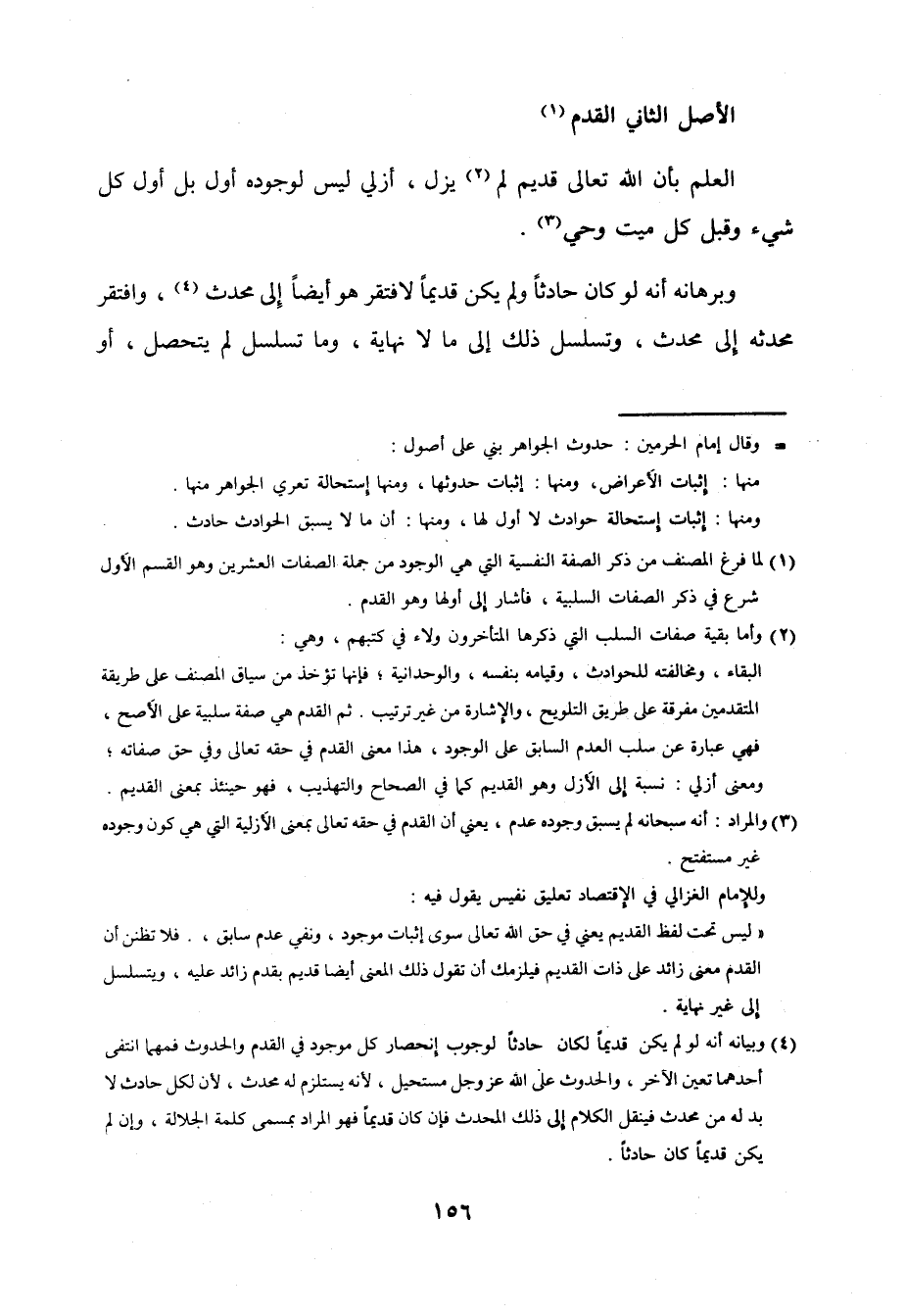 وبرهانه أَنه لَو كَانَ حَادِثا وَلم يكن قَدِيما لافتقر هُوَ أَيْضا إِلَى مُحدث وافتقر محدثه إِلَى مُحدث وتسلسل ذَلِك إِلَى مَا لَا نِهَايَة وَمَا تسلسل لم يتَحَصَّل أَو