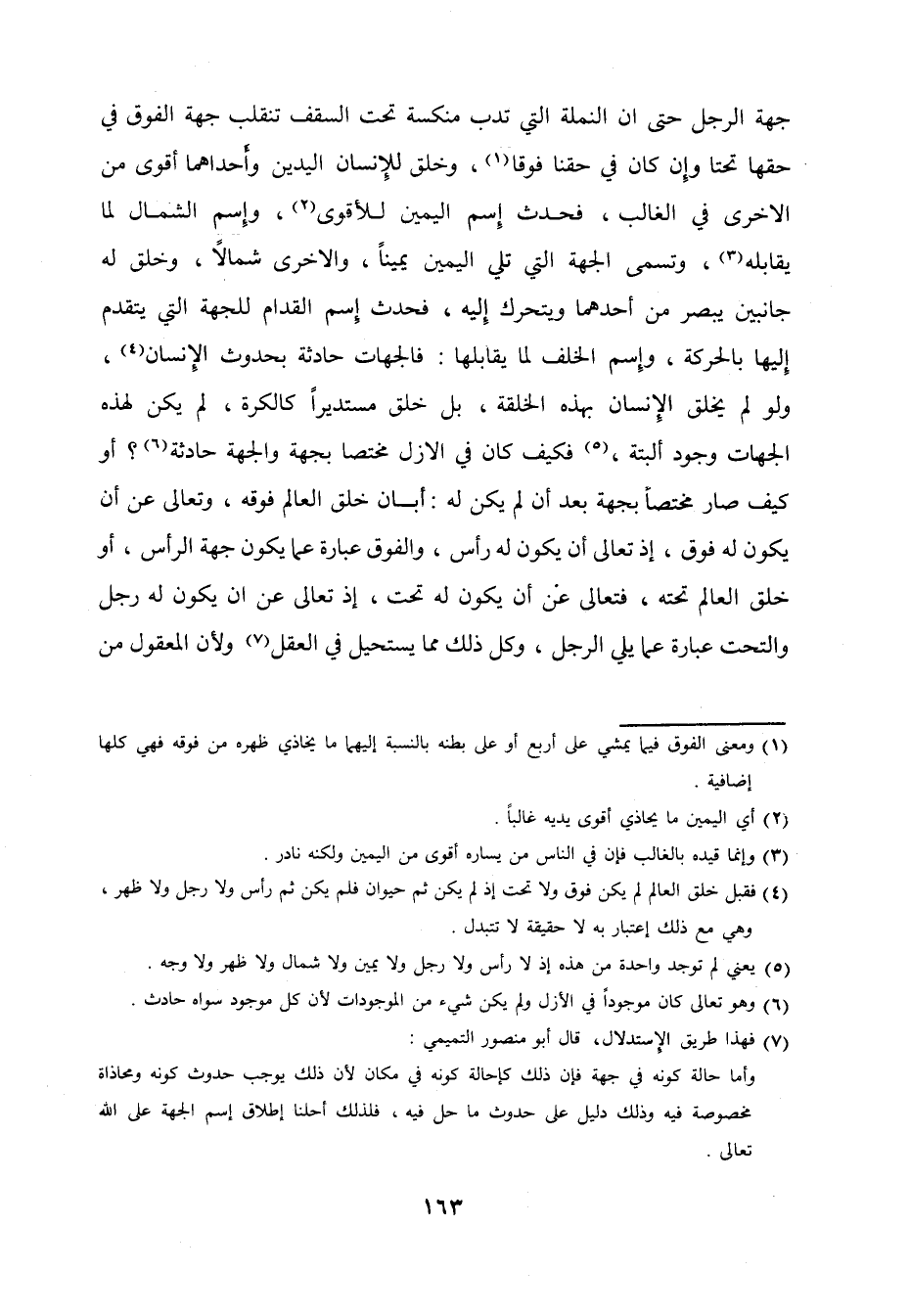 جِهَة الرجل حَتَّى إِن النملة الَّتِي تدب منكسة تَحت السّقف تنْقَلب جِهَة الفوق فِي حَقّهَا تحتاً وَإِن كَانَ فِي حَقنا فوقاً وَخلق للْإنْسَان الْيَدَيْنِ وإحداهما أقوى من الْأُخْرَى فِي الْغَالِب فَحدث اسْم الْيَمين للأقوى وَاسم الشمَال لما يُقَابله وَتسَمى الْجِهَة الَّتِي تلِي الْيَمين يَمِينا وَالْأُخْرَى شمالاً وَخلق لَهُ جانبين يبصر من أَحدهمَا ويتحرك إِلَيْهِ فَحدث اسْم القدام للجهة الَّتِي يتَقَدَّم إِلَيْهَا بالحركة وَاسم الْخلف لما يقابلها فالجهات حَادِثَة بحدوث الْإِنْسَان وَلَو لم يخلق الْإِنْسَان بِهَذِهِ الْخلقَة بل خلق مستديراً كالكرة لم يكن لهَذِهِ الْجِهَات وجود ألبته فَكيف كَانَ فِي الْأَزَل مُخْتَصًّا بِجِهَة والجهة حَادِثَة أَو كَيفَ صَار مُخْتَصًّا بِجِهَة بعد أَن لم يكن لَهُ أبأن خلق الْعَالم فَوْقه وَتَعَالَى عَن أَن يكون لَهُ فَوق إِذْ تَعَالَى أَن يكون لَهُ رَأس والفوق عبارَة عَمَّا يكون جِهَة الرَّأْس أَو خلق الْعَالم تَحْتَهُ فتعالى عَن أَن يكون لَهُ تَحت إِذْ تَعَالَى عَن أَن يكون لَهُ رجل والتحت عبارَة عَمَّا يَلِي الرجل وكل ذَلِك مِمَّا يَسْتَحِيل فِي الْعقل وَلِأَن الْمَعْقُول من