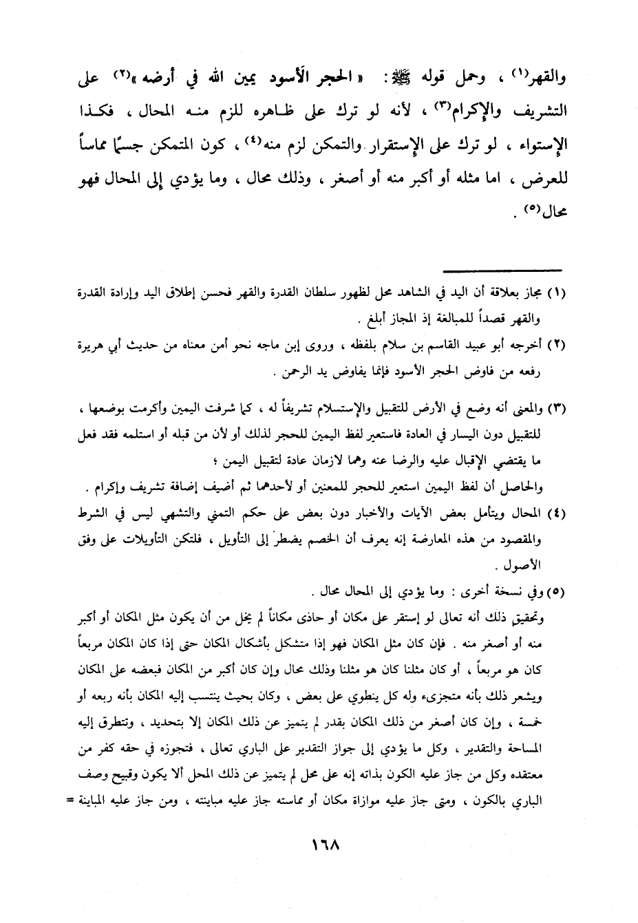 والقهر وَحمل قَوْله صلى الله عَلَيْهِ وَسلم الْحجر الْأسود يَمِين الله فِي أرضه على التشريف وَالْإِكْرَام لِأَنَّهُ لَو ترك على ظَاهره للَزِمَ مِنْهُ الْمحَال فَكَذَا الاسْتوَاء لَو ترك على الِاسْتِقْرَار والتمكن لزم مِنْهُ كَون المتمكن جسماً مماساً للعرض إِمَّا مثله أَو أكبر مِنْهُ أَو أَصْغَر وَذَلِكَ محَال وَمَا يُؤَدِّي إِلَى الْمحَال فَهُوَ محَال