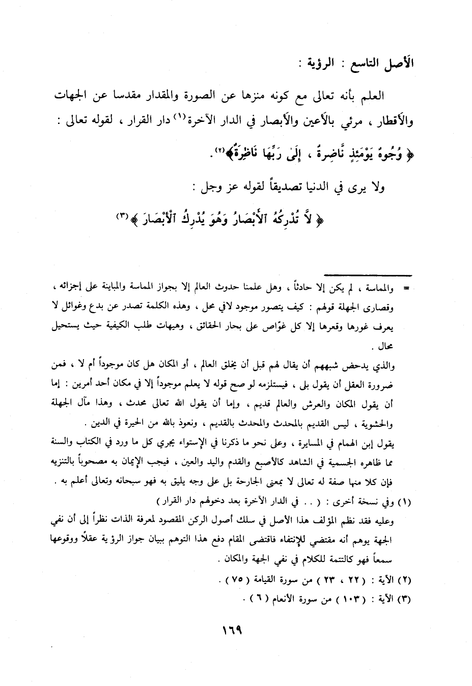 الْعلم بِأَنَّهُ تَعَالَى مَعَ كَونه منزهاً عَن الصُّورَة والمقدار مقدساً عَن الْجِهَات والأقطار مرئي بالأعين والأبصار فِي الدَّار الْآخِرَة دَار الْقَرار لقَوْله تَعَالَى {وُجُوه يَوْمئِذٍ ناضرة إِلَى رَبهَا ناظرة}