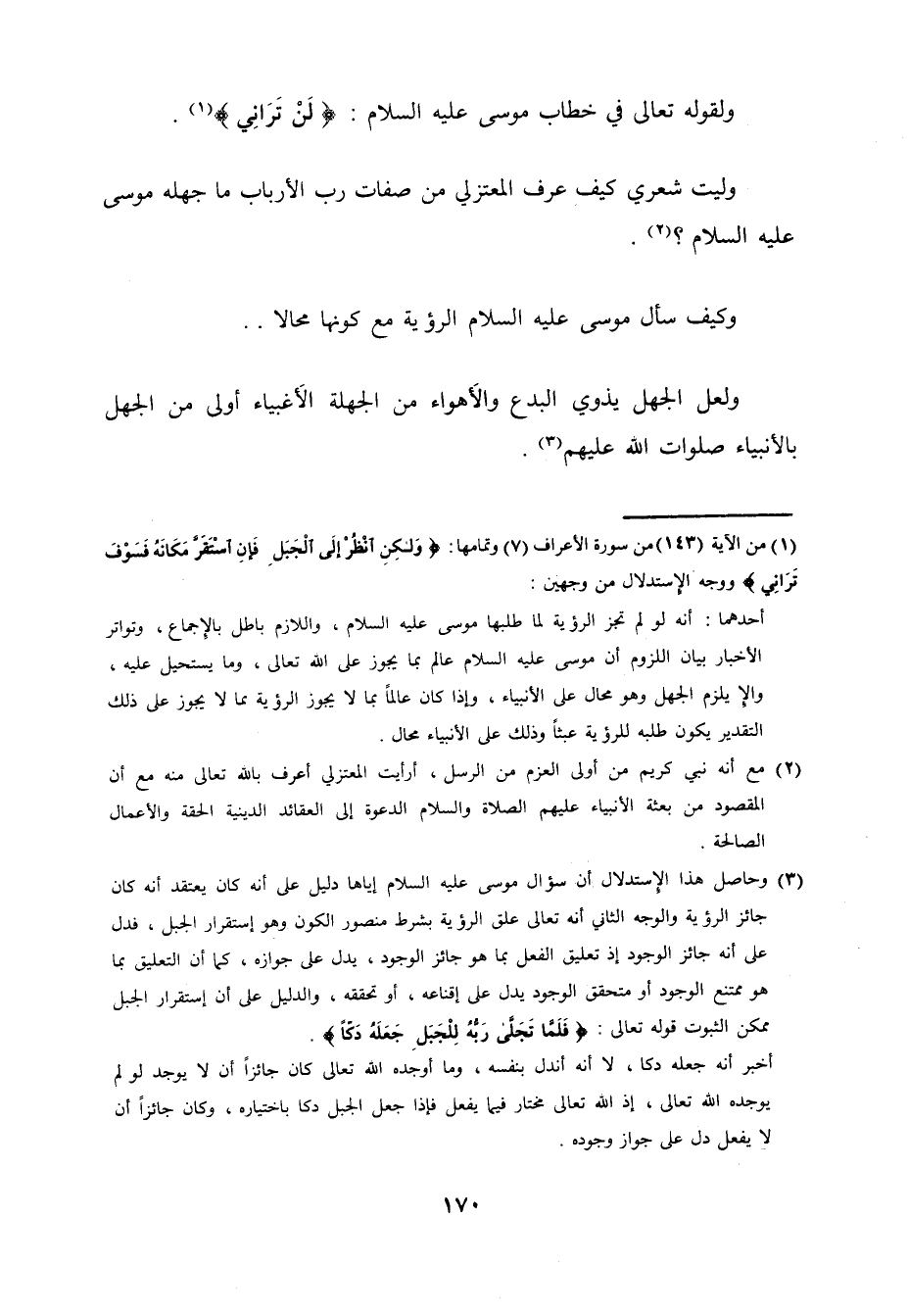 وليت شعري كَيفَ عرف المعتزلي من صِفَات رب الأرباب مَا جَهله مُوسَى عَلَيْهِ السَّلَام