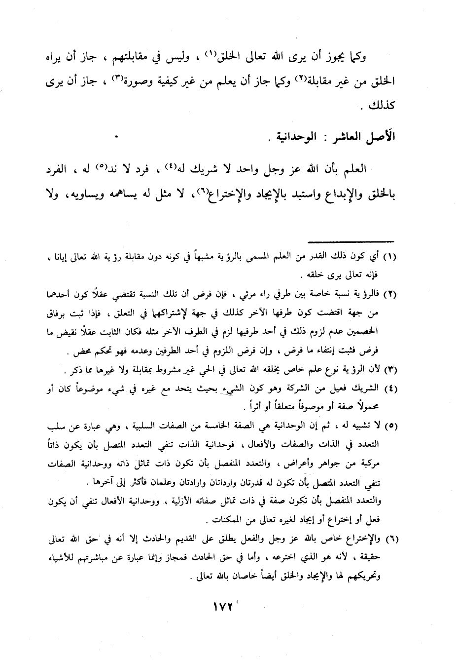 الْعلم بِأَن الله عز وَجل وَاحِد لَا شريك لَهُ فَرد لَا ند لَهُ الْفَرد بالخلق والإبداع واستبد بالإيجاد والاختراع لَا مثل لَهُ يساهمه ويساويه وَلَا