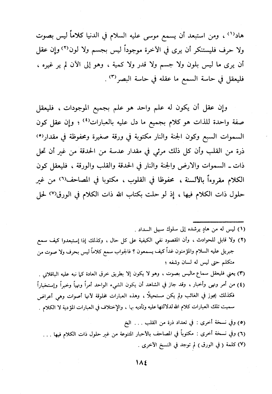 وَإِن عقل أَن يكون لَهُ علم وَاحِد هُوَ علم بِجَمِيعِ الموجودات فليعقل صفة وَاحِدَة للذات هُوَ كَلَام بِجَمِيعِ مَا دلّ عَلَيْهِ بالعبارات وَإِن عقل كَون السَّمَاوَات السَّبع وَكَون الْجنَّة وَالنَّار مَكْتُوبَة فِي ورقة صَغِيرَة ومحفوظة فِي مِقْدَار ذرة من الْقلب وَأَن كل ذَلِك مرئي فِي مِقْدَار عدسة من الحدقة من غير أَن تحل ذَات السَّمَاوَات وَالْأَرْض وَالْجنَّة وَالنَّار فِي الحدقة وَالْقلب والورقة فليعقل كَون الْكَلَام مقروءاً بالألسنة مَحْفُوظًا فِي الْقُلُوب مَكْتُوبًا فِي الْمَصَاحِف من غير حُلُول ذَات الْكَلَام فِيهَا إِذْ لَو حَلّت بِكِتَاب الله ذاتُ الْكَلَام فِي الْوَرق لحل