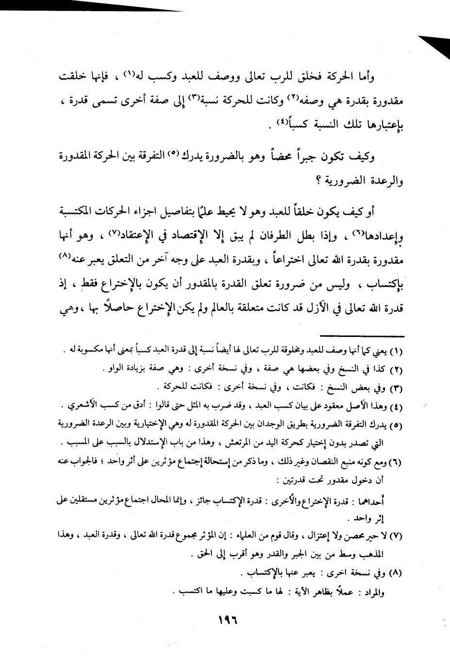وَأما الْحَرَكَة فخلق للرب تَعَالَى وَوصف للْعَبد وَكسب لَهُ فَإِنَّهَا خلقت مقدورة بقدرة هِيَ وَصفه وَكَانَت للحركة نِسْبَة إِلَى صفة أُخْرَى تسمى قدرَة بإعتبارها تِلْكَ النِّسْبَة كسباً