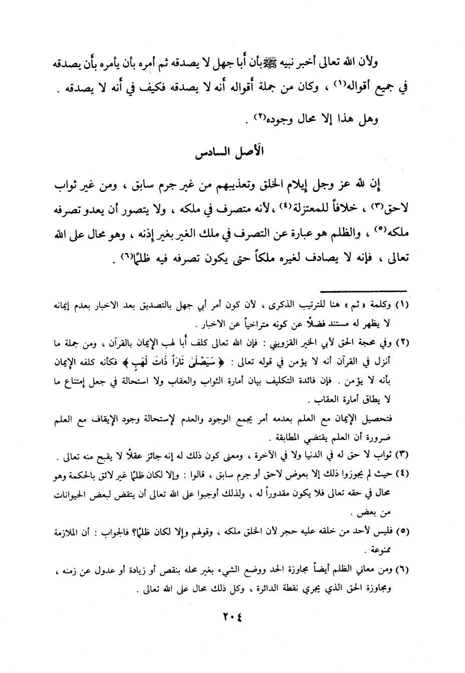 أَن لله عز وَجل إيلام الْخلق وتعذيبهم من غير جرم سَابق وَمن غير ثَوَاب لَاحق خلافًا للمعتزلة لِأَنَّهُ متصرف فِي ملكه وَلَا يتَصَوَّر أَن يعدو تصرفه ملكه وَالظُّلم هُوَ عبارَة عَن التَّصَرُّف فِي ملك الْغَيْر بِغَيْر إِذْنه وَهُوَ محَال على الله تَعَالَى فَإِنَّهُ لَا يُصَادف لغيره ملكا حَتَّى يكون تصرفه فِيهِ ظلما