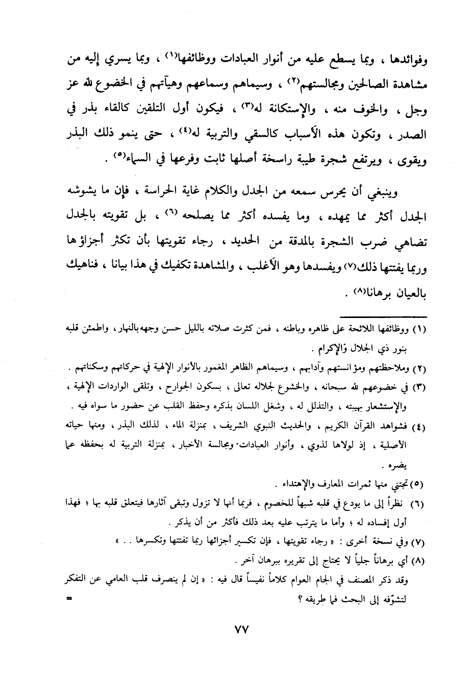 وَيَنْبَغِي أَن يحرس سَمعه من الجدل وَالْكَلَام غَايَة الحراسة فَإِن مَا يشوشه الجدل أَكثر مِمَّا يمهده وَمَا يُفْسِدهُ أَكثر مِمَّا يصلحه بل تقويته بالجدل تضاهي ضرب الشَّجَرَة بالمدقة من الْحَدِيد رَجَاء تقويتها بِأَن تكْثر أجزاؤها وَرُبمَا يفتتها ذَلِك ويفسدها وَهُوَ الْأَغْلَب والمشاهدة تكفيك فِي هَذَا بَيَانا فناهيك بالعيان برهانا