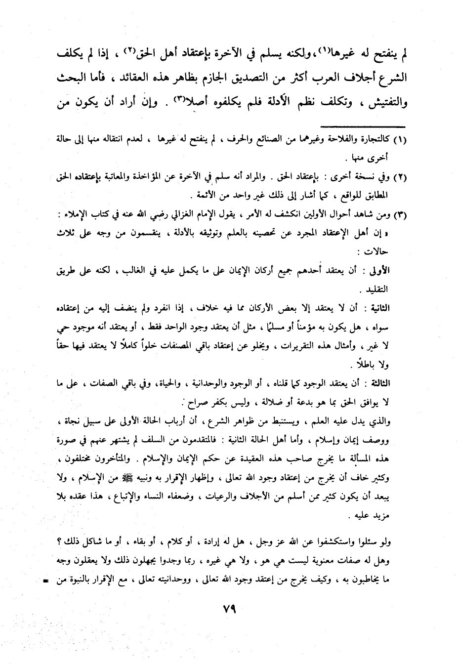 لم ينفتح لَهُ غَيرهَا وَلكنه يسلم فِي الْآخِرَة بإعتقاد أهل الْحق إِذا لم يُكَلف الشَّرْع أجلاف الْعَرَب أَكثر من التَّصْدِيق الْجَازِم بِظَاهِر هَذِه العقائد فَأَما الْبَحْث والتفتيش وتكلف نظم الْأَدِلَّة فَلم يكلفوه أصلا وَإِن أَرَادَ أَن يكون من