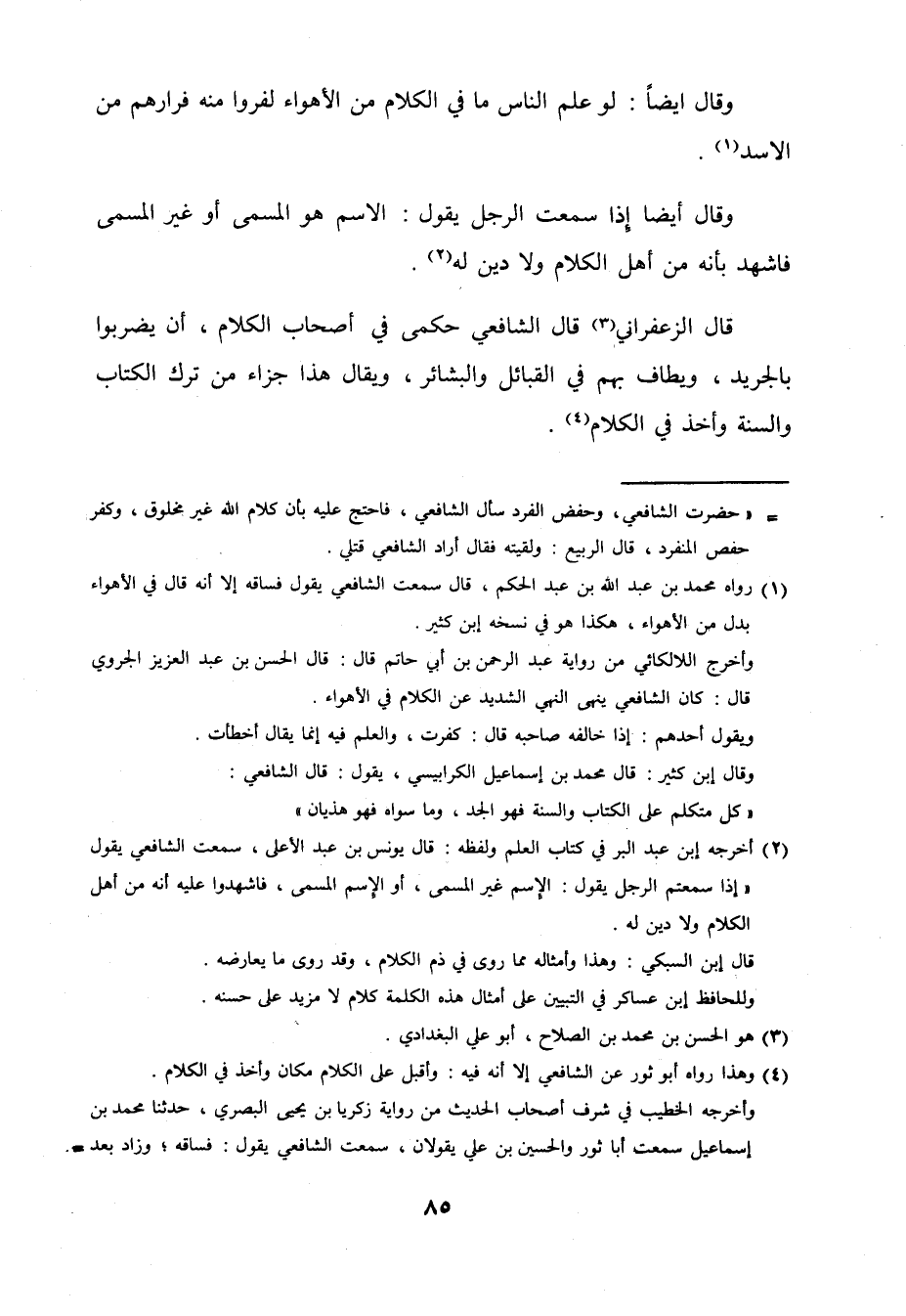 وَقَالَ أَيْضا لَو علم النَّاس مَا فِي الْكَلَام من الْأَهْوَاء لفروا مِنْهُ فرارهم من الْأسد