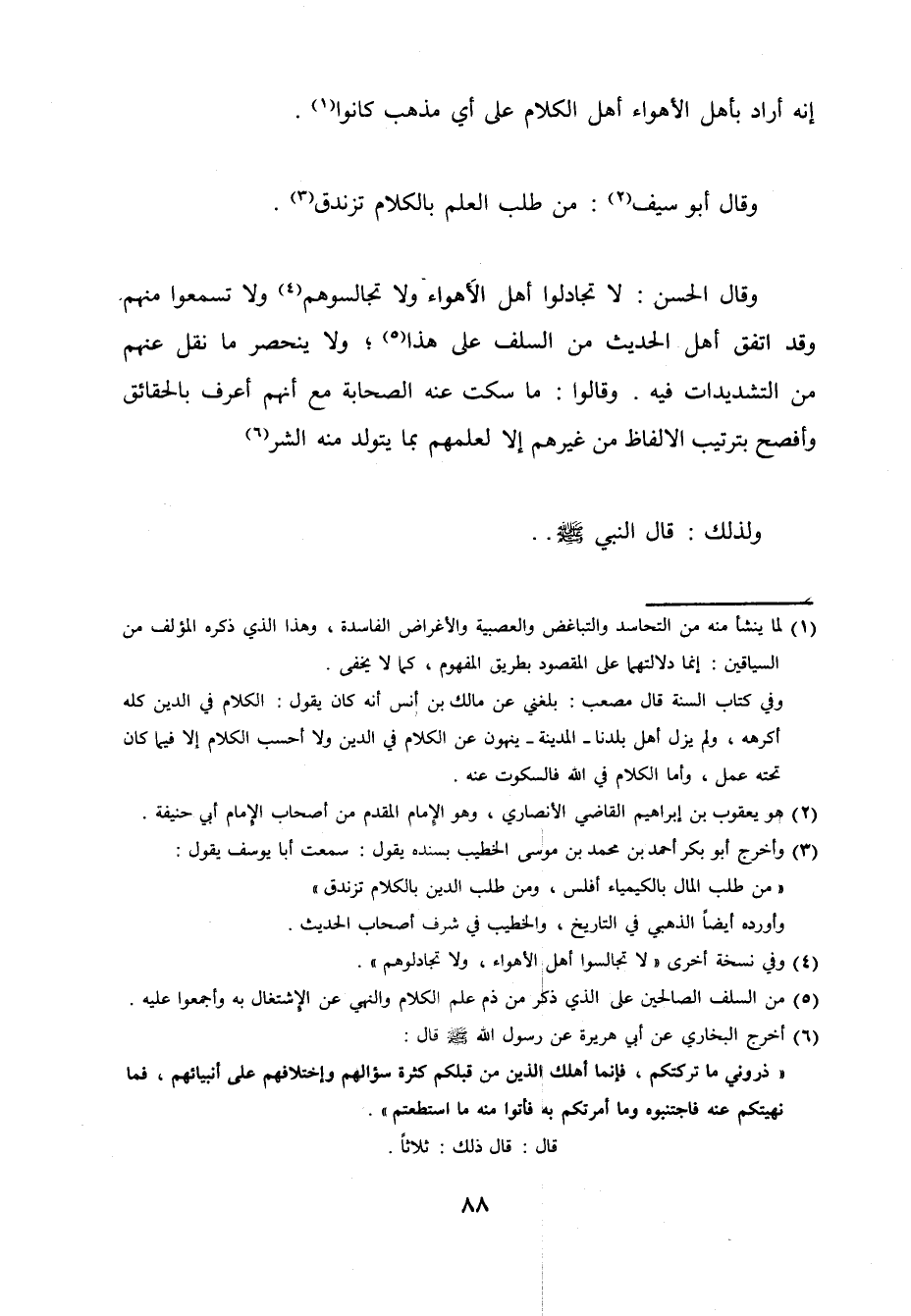 وَقَالَ الْحسن لَا تجادلوا أهل الْأَهْوَاء وَلَا تُجَالِسُوهُمْ وَلَا تسمعوا مِنْهُم وَقد اتّفق أهل الحَدِيث من السّلف على هَذَا وَلَا ينْحَصر مَا نقل عَنْهُم من التشديدات فِيهِ وَقَالُوا مَا سكت عَنهُ الصَّحَابَة مَعَ أَنهم أعرف بالحقائق وأفصح بترتيب الْأَلْفَاظ من غَيرهم إِلَّا لعلمهم بِمَا يتَوَلَّد مِنْهُ الشَّرّ