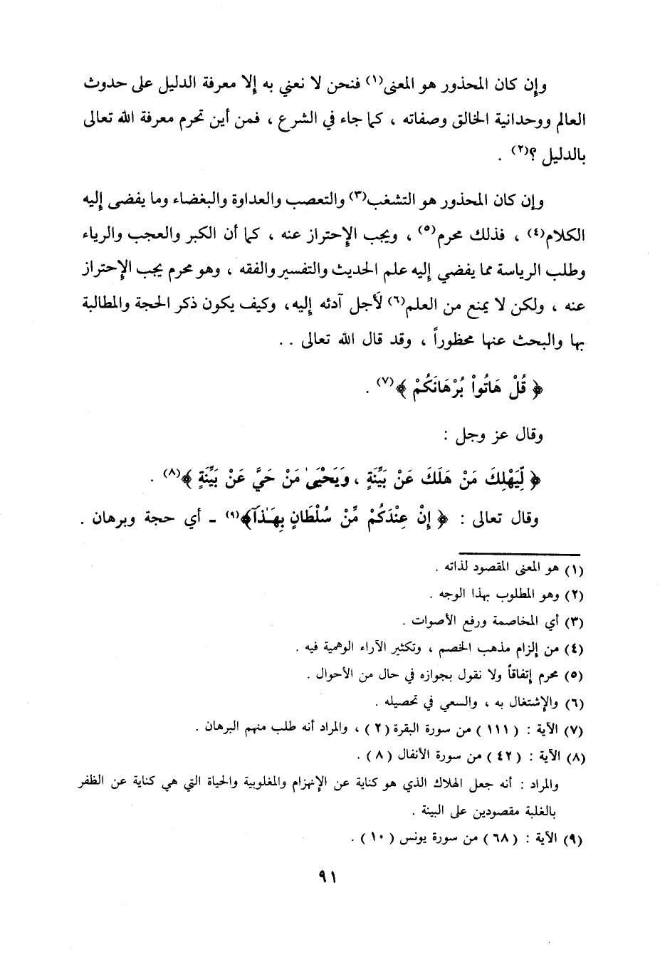 وَإِن كَانَ الْمَحْذُور هُوَ التشغب والتعصب والعداوة والبغضاء وَمَا يُفْضِي إِلَيْهِ الْكَلَام فَذَلِك محرم وَيجب الإحتراز عَنهُ كَمَا أَن الْكبر وَالْعجب والرياء وَطلب الرياسة مِمَّا يُفْضِي إِلَيْهِ علم الحَدِيث وَالتَّفْسِير وَالْفِقْه وَهُوَ محرم يجب الإحتراز عَنهُ وَلَكِن لَا يمْنَع من الْعلم لأجل آدئه إِلَيْهِ وَكَيف يكون ذكر الْحجَّة والمطالبة بهَا والبحث عَنْهَا مَحْظُورًا وَقد قَالَ الله تَعَالَى {قل هاتوا برهانكم}