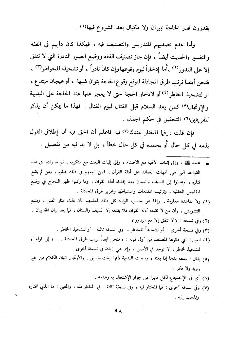 وَأما عدم تصديهم للتدريس والتصنيف فِيهِ فَهَكَذَا كَانَ دأبهم فِي الْفِقْه وَالتَّفْسِير والْحَدِيث أَيْضا فَإِن جَازَ تصنيف الْفِقْه وَوضع الصُّور النادرة الَّتِي لَا تتفق إِلَّا على الندور أما إدخارا ليَوْم وُقُوعهَا وَإِن كَانَ نَادرا أَو تشحيذا للخواطر فَنحْن أَيْضا نرتب طرق المجادلة لتوقع وُقُوع الْحَاجة بثوان شُبْهَة أَو هيجان مُبْتَدع أَو لتشحيذ الخاطر أَو لإدخار الْحجَّة حَتَّى لَا يعجز عَنْهَا عِنْد الْحَاجة على البديهة والإرتجال كمن يعد السَّلَام قبل الْقِتَال ليَوْم الْقِتَال فَهَذَا مَا يُمكن أَن يذكر لِلْفَرِيقَيْنِ التَّحْقِيق فِي حكم الجدل