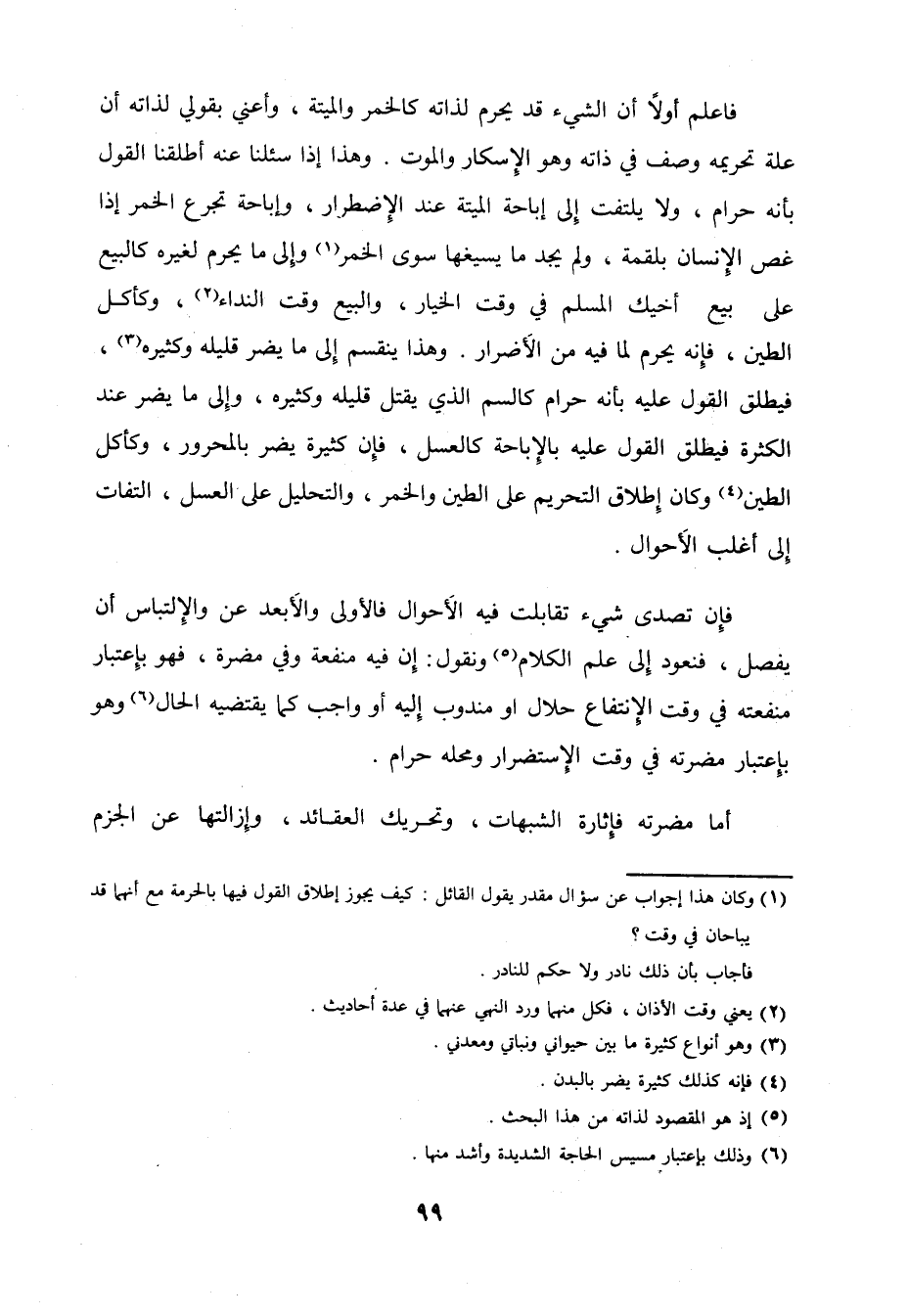 فَإِن تصدى شَيْء تقابلت فِيهِ الْأَحْوَال فَالْأولى والأبعد عَن والإلتباس أَن يفصل فنعود إِلَى علم الْكَلَام ونقول إِن فِيهِ مَنْفَعَة وَفِي مضرَّة فَهُوَ بإعتبار منفعَته فِي وَقت الإنتفاع حَلَال أَو مَنْدُوب إِلَيْهِ أَو وَاجِب كَمَا يَقْتَضِيهِ الْحَال وَهُوَ بإعتبار مضرته فِي وَقت الإستضرار وَمحله حرَام