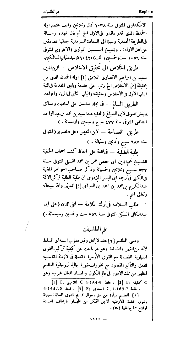 وهو علم باحث عن كيفية تركيب القوى السماوية الفعالة، مع القوى الأرضية المنفعلة، في الأزمنة المناسبة للفعل والتأثير المقصود، مع بخورات مقوية، جالبة لروحانية الطلسم، ليظهر من تلك الأمور في عالم الكون والفساد أفعال غريبة، وهو (2/ 1115) قريب المأخذ بالنسبة إلى السحر، لكون مباديه وأسبابه معلومة.