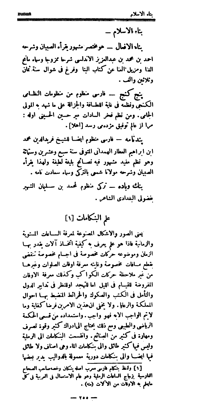 وانقسمت البنكامات: إلى الرملية، وليس فيها كثير طائل، وإلى بنكامات الماء، وهي: أصناف، ولا طائل فيها أيضا، وإلى بنكامات دورية، معمولة بالدواليب، يدير بعضها (1/ 256) بعضا.