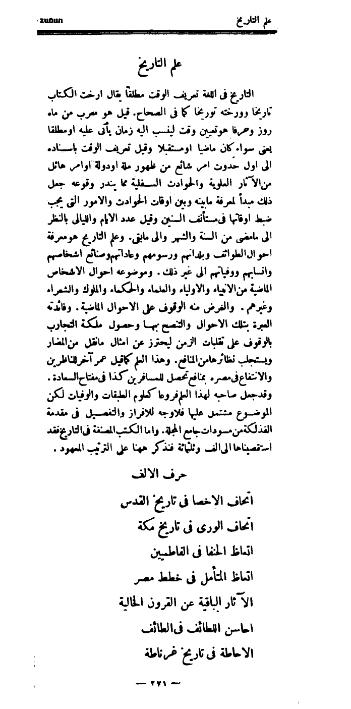وعلم التاريخ: هو معرفة أحوال الطوائف، وبلدانهم، ورسومهم، وعاداتهم، وصنائع أشخاصهم، وأنسابهم، ووفياتهم، ... إلى غير ذلك.