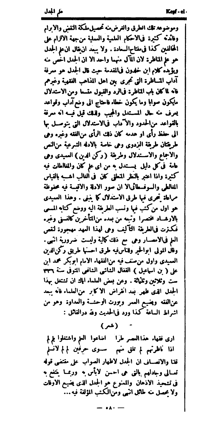 ويؤيده كلام ابن خلدون في المقدمة حيث قال: الجدل هو معرفة آداب المناظرة التي تجري بين أهل المذاهب الفقهية وغيرهم، فإنه لما كان باب المناظرة في الرد والقبول متسعاً، ومن الاستدلال ما يكون صواباً، وما يكون خطاء، فاحتاج إلى وضع آداب وقواعد يعرف منه حال المستدل والمجيب.