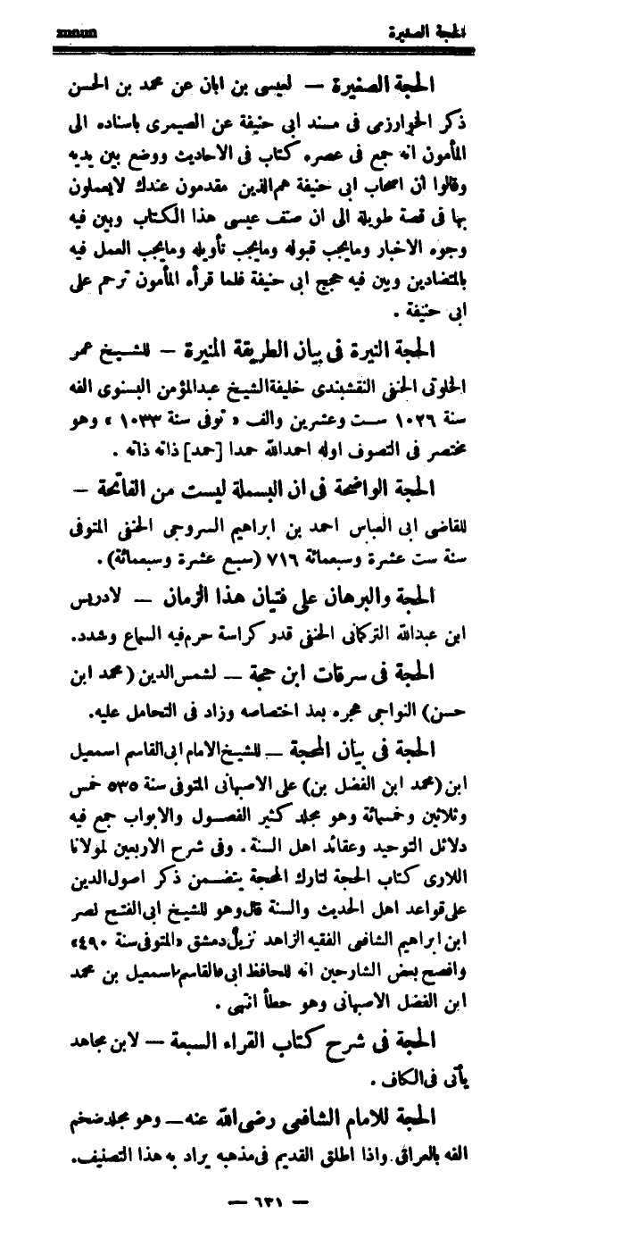 وفي شرح الأربعين لمولانا اللاري: كتاب الحجة لتارك المحجة يتضمن: ذكر أصول الدين على قواعد أهل الحديث والسنة.