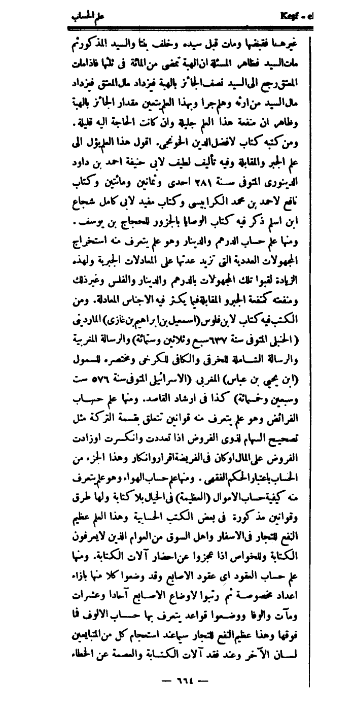 وفيه كتب منفردة غير ما بين في مبسوطات الكتب الحسابية، وأما المصنفات في علم الحساب مطلقاً، فنذكرها على ترتيب الكتاب إجمالاً، وهي هذه: