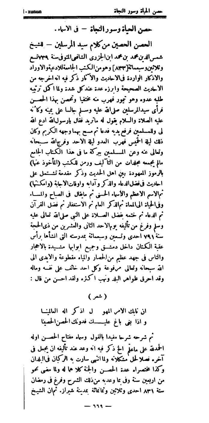 ذكر فيه أنه وعد عند تأليفه أن يجعل في آخره فصلاً لحل مشكلاته، ولما انتهى سارت به الركبان في البلدان، وكذا مختصراه (عدة الحصن) و (الجنة) كلاهما له.