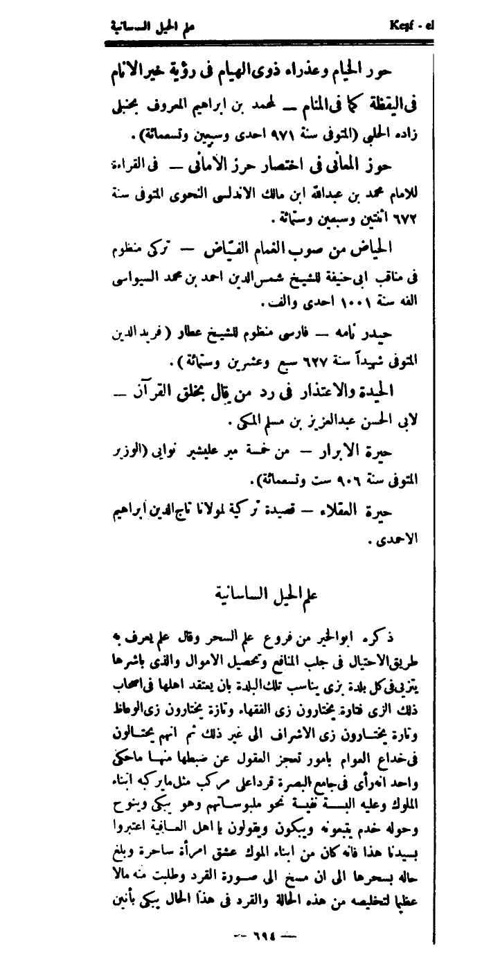 وقال: علم يعرف به طريق الاحتيال في جلب المنافع، وتحصيل الأموال، والذي باشرها يتزيى في كل بلدة، بزي يناسب تلك البلدة، بأن يعتقد أهلها بأصحاب ذلك الزي، فتارة يختارون زي الفقهاء، وتارة يختارون زي الوعاظ، وتارة يختارون زي الأشراف، إلى غير ذلك.