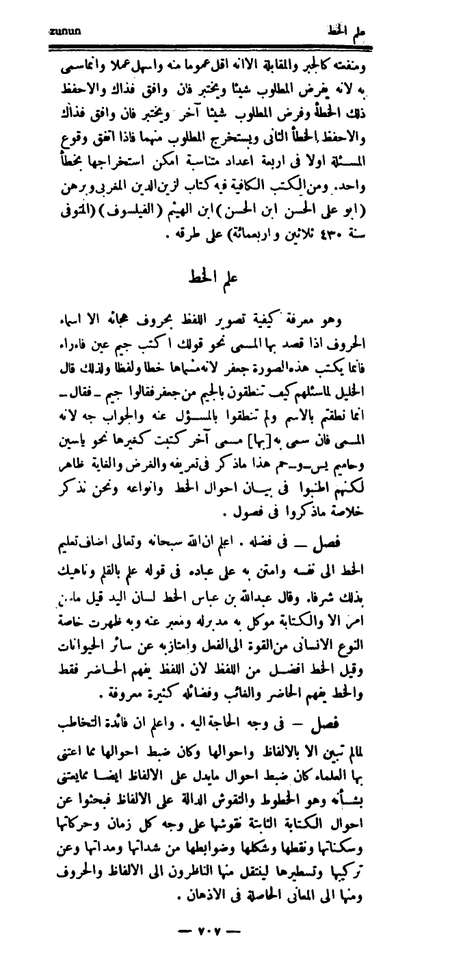 واعلم أن فائدة التخاطب لما لم تبين إلا بالألفاظ وأحوالها، وكان ضبط أحوالها مما اعتنى بها العلماء، كان ضبط أحوال ما يدل على الألفاظ أيضاً مما يعتنى بشأنه وهو الخطوط، والنقوش الدالة على الألفاظ، فبحثوا عن أحوال الكتابة الثابتة، نقوشها على وجه كل زمان، وحركاتها، وسكناتها، ونقطها، وشكلها، وضوابطها من شداتها ومداتها، وعن تركيبها وتسطيرها، لينتقل منها الناظرون إلى الألفاظ والحروف، ومنها إلى المعاني الحاصلة في الأذهان.