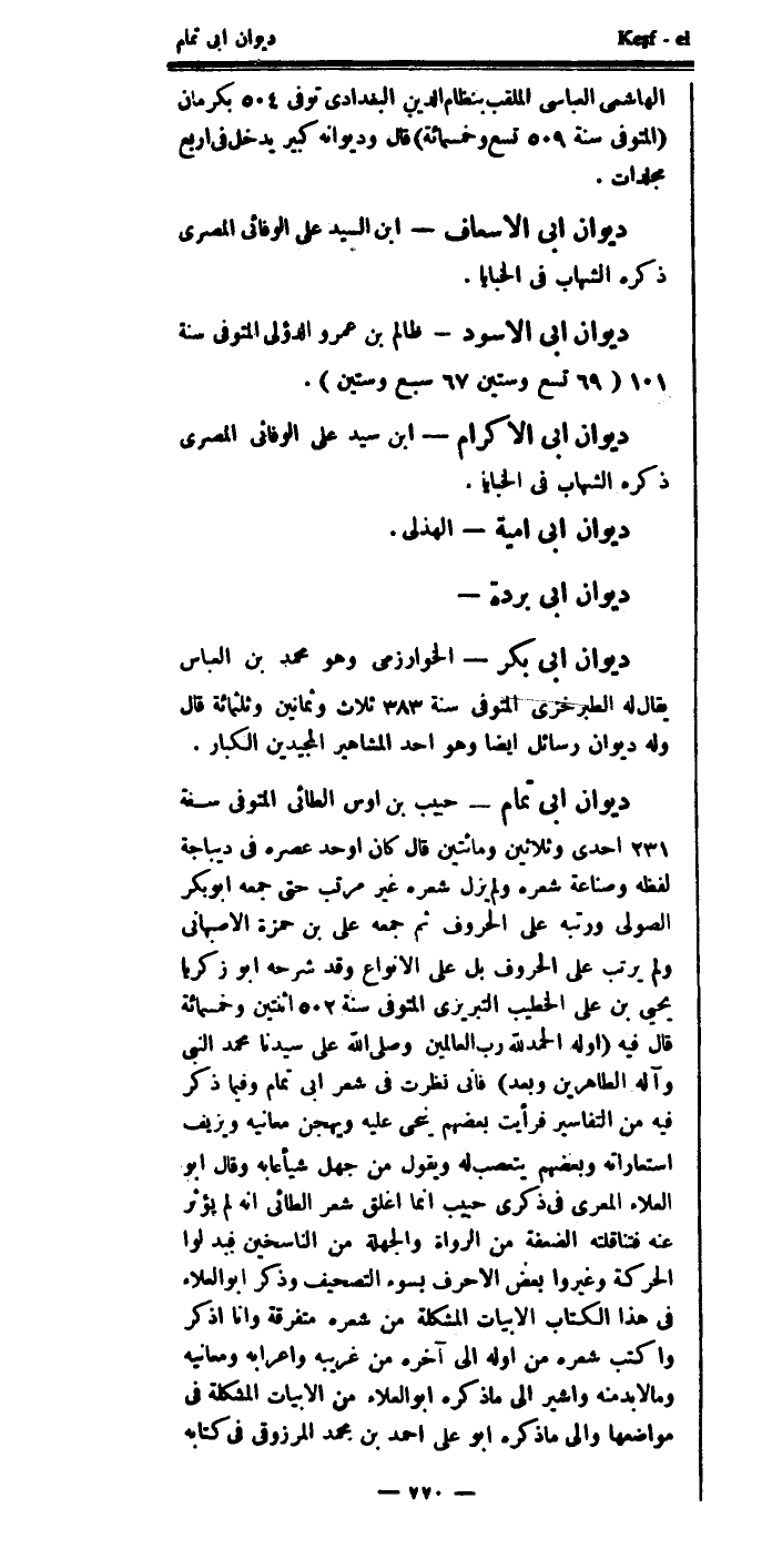 وقال ابن خلكان في ترجمة أبي العلاء أحمد بن سليمان بن عبد الله المعري، التنوخي المتوفى: سنة 449 تسع وأربعين وأربعمائة: واختصر ديوان أبي تمام وسماه (ذكرى حبيب) وفي بعض التواريخ أنه فسر شعر أبي تمام في ستين كراسة.