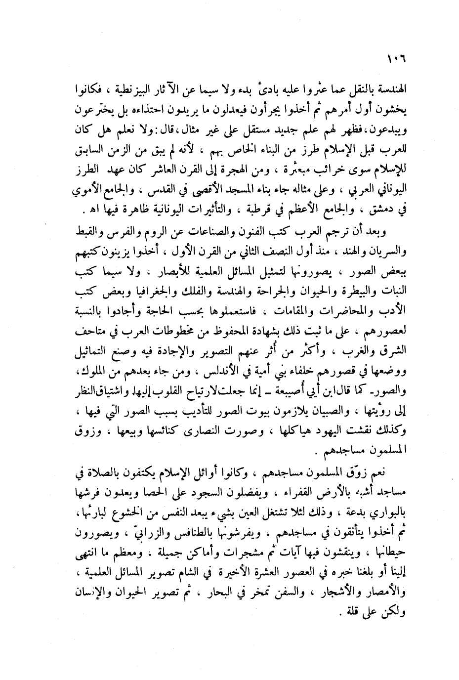 الهندسة بالنقل عما عثروا عليه بادئ بدء ولا سيما عن الآثار البيزنطية، فكانوا يخشون أول أمرهم ثم أخذوا يجرأون فيعدلون ما يريدون احتذاءه بل يخترعون ويبدعون، فظهر لهم علم جديد مستق على غير مثال، قال: ولا نعلم هل كان للعرب قبل الإسلام طرز من البناء الخاص بهم، لأنه لم يبق من الزم السابق للإسلام سوى خرائب مبعثرة، ومن الهجرة إلى القرن العاشر كان عهد الطرز اليوناني العربي، وعلى مثاله جاء بناء المسجد الأقصى في القدس، والجامع الأموي في دمشق، والجامع الأعظم في قرطبة، والتأثيرات اليونانية ظاهرة فيها اه.