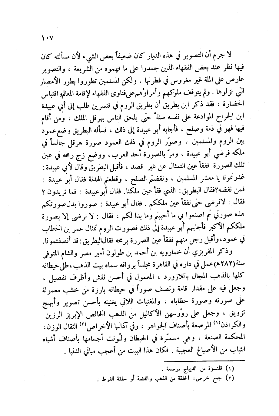 لا جرم أن التصوير في هذه الديار كان ضعيفاً بعض الشيء لأن مسألته كان فيها نظر عند بعض الفقهاء الذين جمدوا على ما فهموه من الشريعة، والتصوير عارض على الملة غير مغروس في فطرتها، ولكن المسلمين تطوروا بطور الأمصار التي نزلوها. ولم يتوقف ملوكهم وأمراؤهم على فتاوى الفقهاء لإقامة المعالم واقتباس الحضارة، فقد ذكر ابن بطريق أن بطريق الروم في قنسرين طلب إلى أبي عبيدة ابن الجراح الموادعة على نفسه سنةً حتى يلحق الناس بهرقل الملك، ومن أقام فيها فهو في ذمة وصلح، فأجابه أبو عبيدة إلى ذلك، فسأله البطريق وضع عمود بين الروم والمسلمين، وصوّر الروم في ذلك العمود صورة هرقل جالساً في ملكه فرضي أبو عبيدة، ومرّ بالصورة أحد العرب، ووضع زج رمحه في عين تلك الصورة ففقأ عين التمثال عن غير قصد، فأقبل البطريق وقال لأبي عبيدة: غدرتمونا يا معشر المسلمين، ونقضتم الصلح، وقطعتم الهدنة فقال أبو عبيدة: فمن نقضه؟ فقال البطريق: الذي فقأ عين ملكنا. فقال أبو عبيدة: فما تريدون؟ فقال: لا نرضى حتى نفقأ عين ملككم. فقال أبو عبيدة: صوروا بدل