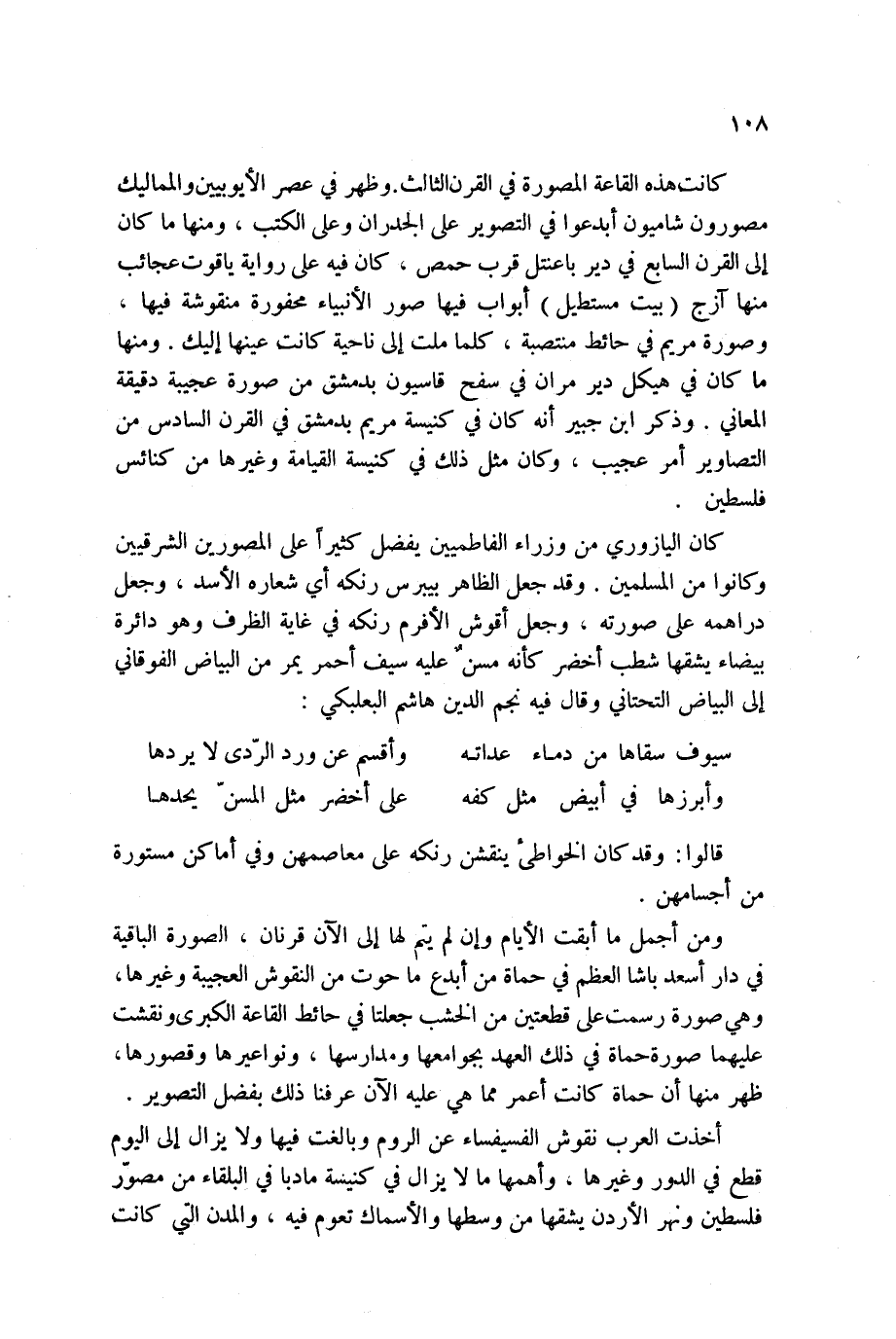كانت هذه القاعة المصورة في القرن الثالث. وظهر في عصر الأيوبيين والمماليك مصورون شاميون أبدعوا في التصوير على الجدران وعلى الكتب، ومنها ما كان إلى القرن السابع في دير باعنتل قرب حمص، كان فيه على رواية ياقوت عجائب منها آزج بيت مستطيل أبواب فيها صور الأنبياء محفورة منقوشة فيها، وصورة مريم في حائط منتصبة، كلما ملت إلى ناحية كانت عينها إليك. ومنها ما كان في هيكل دير مران في سفح قاسيون بدمشق من صورة عجيبة دقيقة المعاني. وذكر ابن جبير أنه كان في كنيسة مريم بدمشق في القرن السادس من التصاوير أمر عجيب، وكان مثل ذلك في كنيسة القيامة وغيرها من كنائس فلسطين.