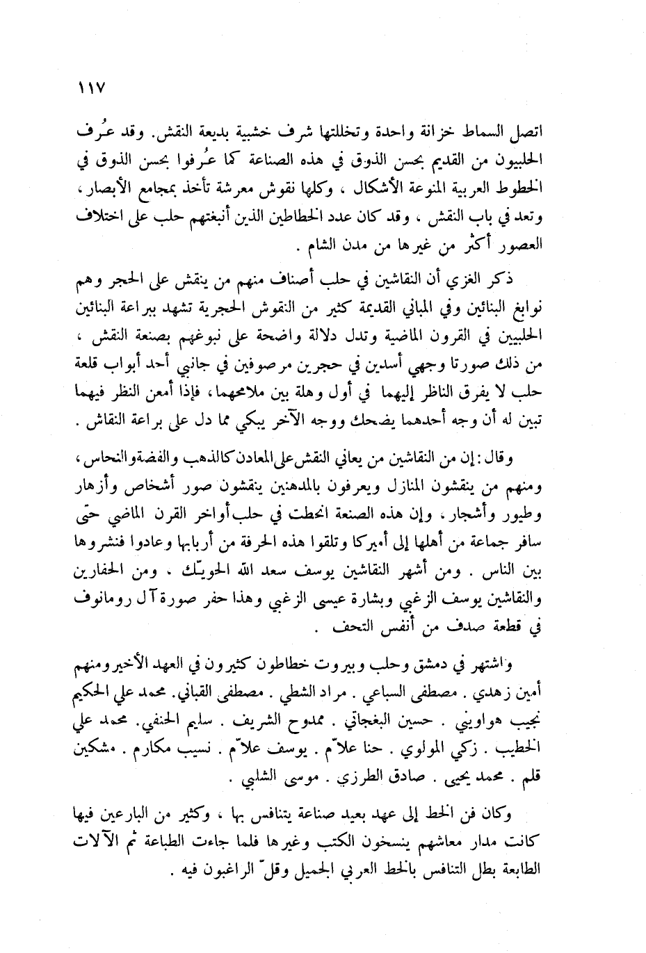 وقال: إن من النقاشين من يعاني النقش على المعادن كالذهب والفضة والنحاس، ومنهم من ينقشون المنازل ويعرفون بالمدهنين ينقشون صور أشخاص وأزهار وطيور وأشجار، وإن هذه الصنعة انحطت في حلب أواخر القرن الماضي حتى سافر جماعة من أهلها إلى أميركا وتلقوا هذه الحرفة من أربابها وعادوا فنشروها بين الناس. ومن أشهر النقاشين يوسف سعد الله الحويّك، ومن الحفارين والنقاشين يوسف الزغبي وبشارة عيسى الزغبي وهذا حفر صورة آل رومانوف في قطعة