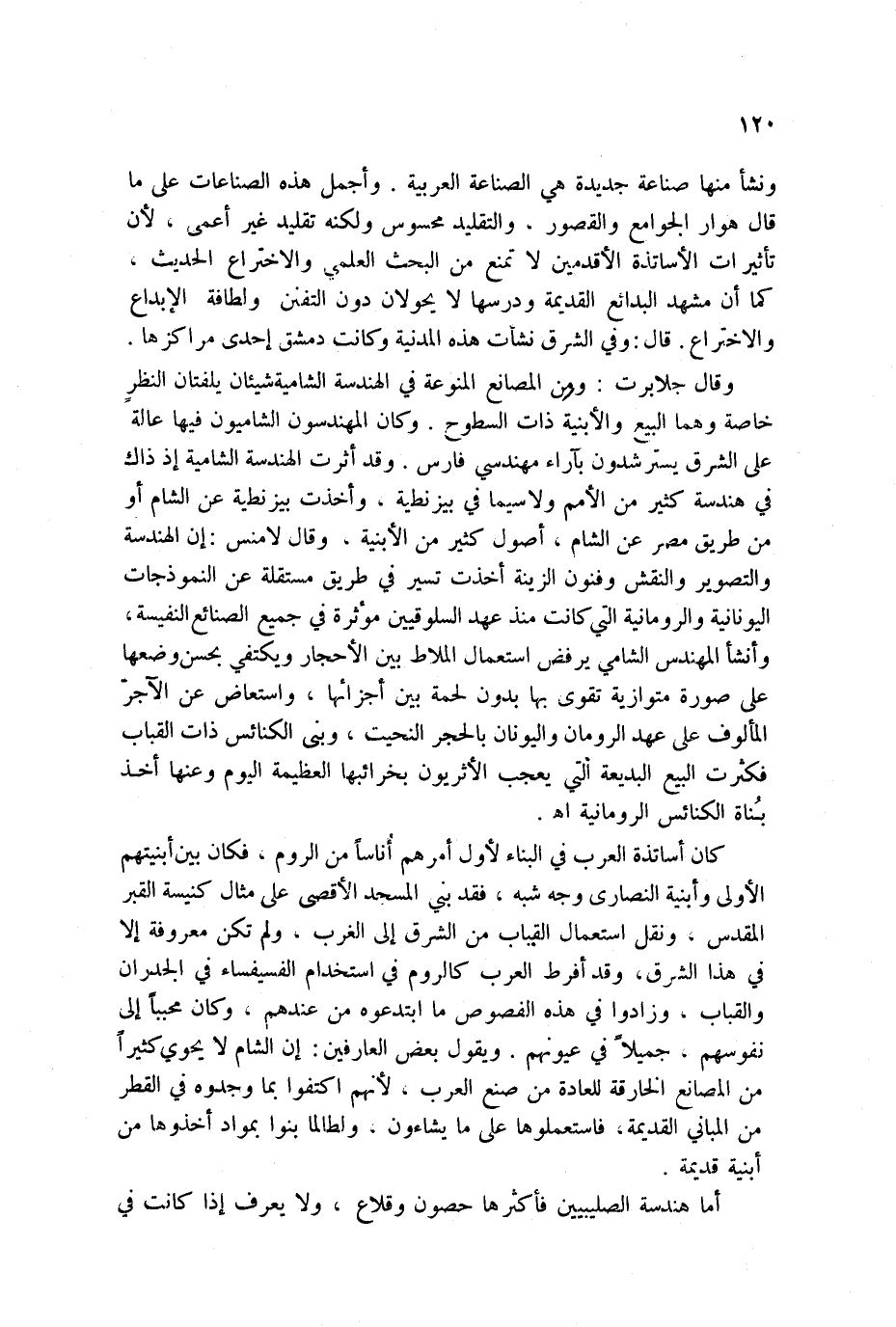 ونشأ منها صناعة جديدة هي الصناعة العربية. وأجمل هذه الصناعات على ما قال هوار الجوامع والقصور، والتقليد محسوس ولكنه تقليد غير أعمى، لأن تأثيرات الأساتذة الأقدمين لا تمنع من البحث العلمي والاختراع الحديث، كما أن مشهد البدائع القديمة ودرسها لا يحولان دون التفنن ولطافة الإبداع والاختراع. قال: وفي الشرق نشأت هذه المدنية وكانت دمشق إحدى مراكزها.